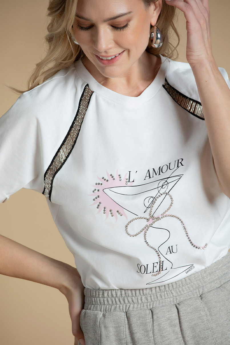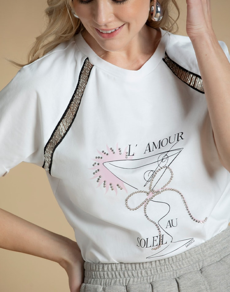 T-shirt confecionada em algodão com decote redondo e manga curta. Pormenor de estampado à frente combinado em contraste.