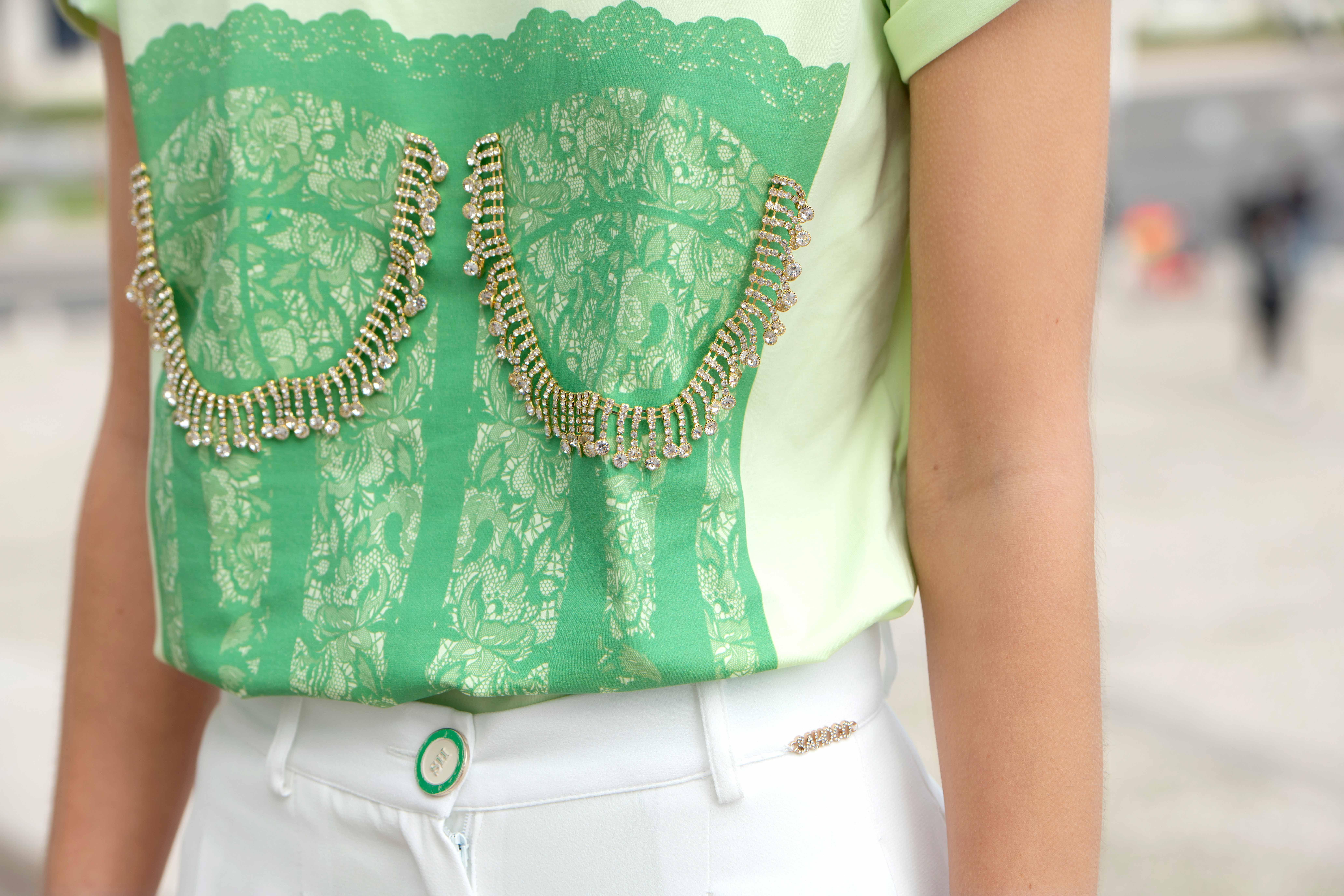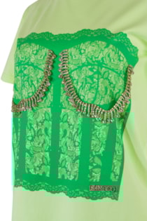 Pormenor de estampado corpete á frente.Pormenor de aplique de brilhos em relevo á frente.