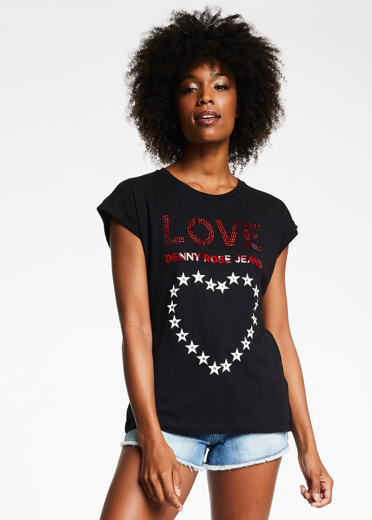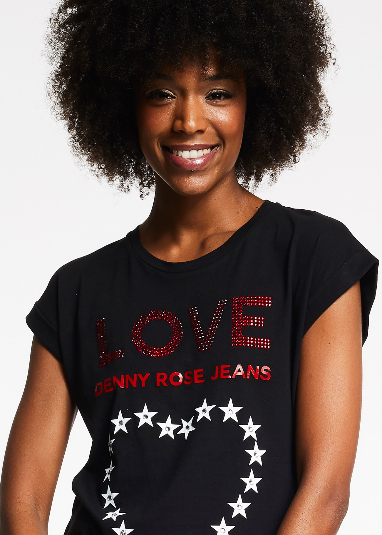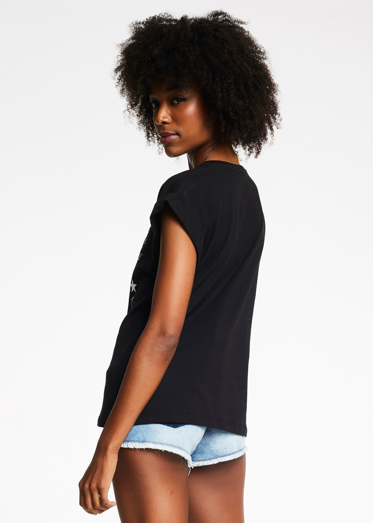 T-shirt em jersey de algodão com estampado de letras e aplique de estrela na frente. Apresenta uma gola redonda e mangas curtas com bainha virada para cima.