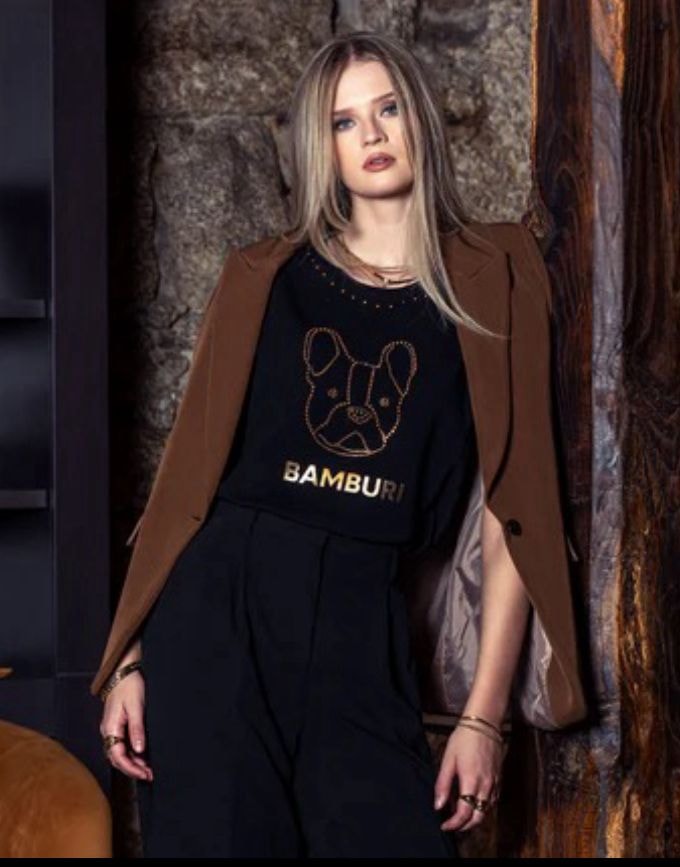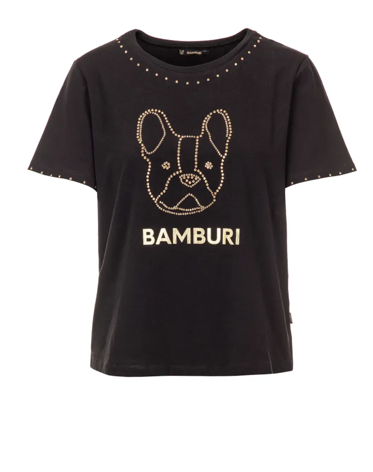 Esta camiseta preta de algodão exibe um dos logotipos característicos da Bamburi — o buldogue francês estilizado — contornado por tachas douradas para uma apresentação ousada e refinada. Detalhes adicionais de tachas no decote e nas mangas adicionam um brilho sutil, tornando-a um item essencial de destaque que captura a sofisticação divertida da marca.