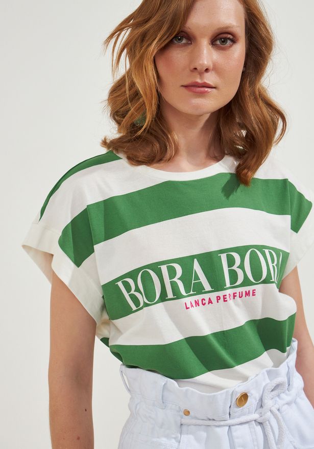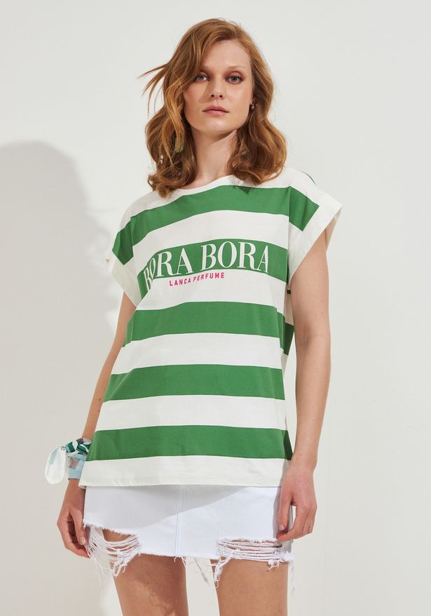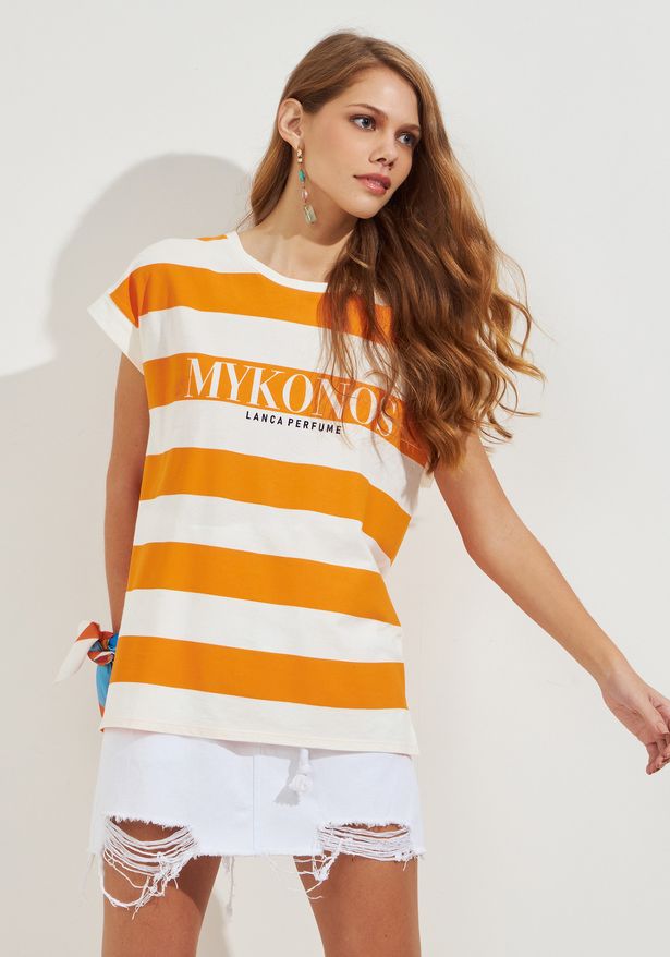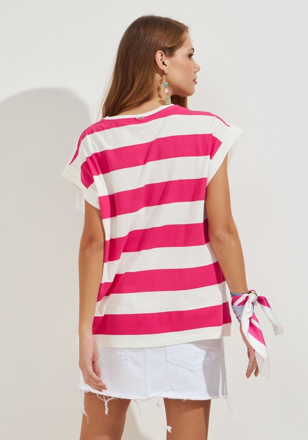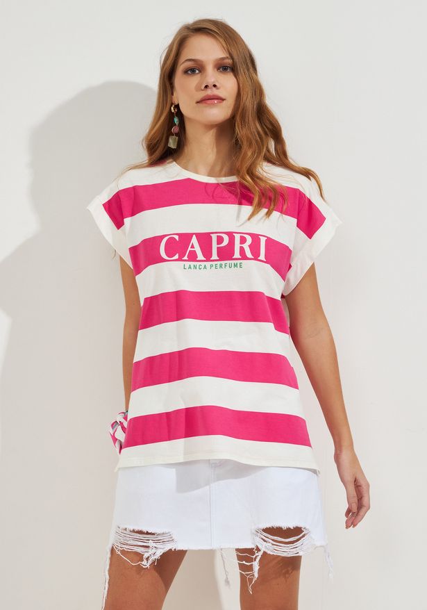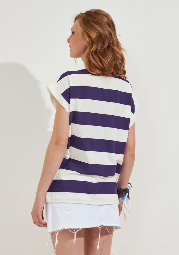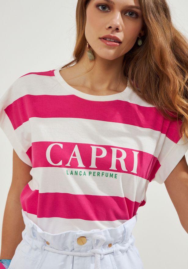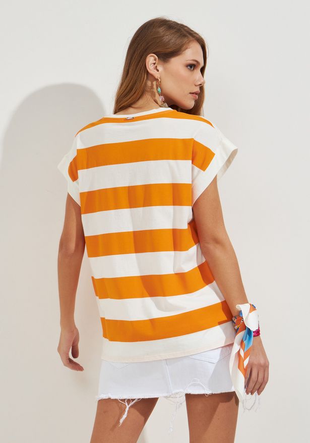 As listras são total a cara do verão. A peça tem estampa localizada, decote redondo e mangas curtas. Aposte com bermuda e rasteira para passeio na praia.