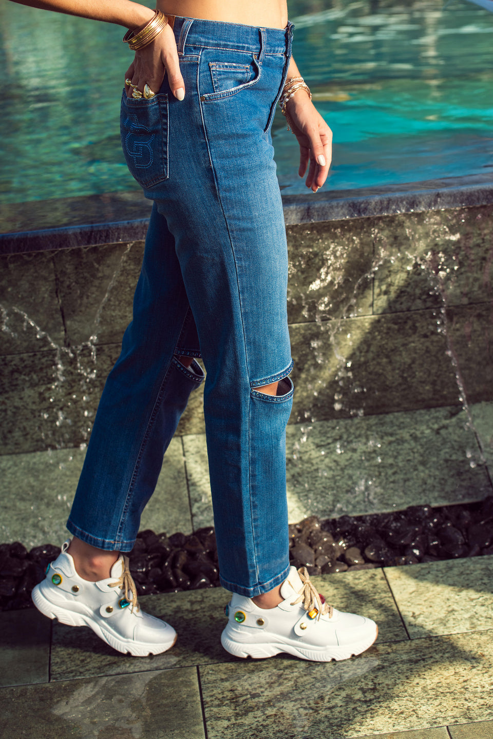 Eleve seu estilo casual com estes tênis brancos com impressionantes enfeites de pedras preciosas e detalhes dourados. Projetados para conforto e declaração, estes tênis adicionam um toque de luxo ao seu look diário.