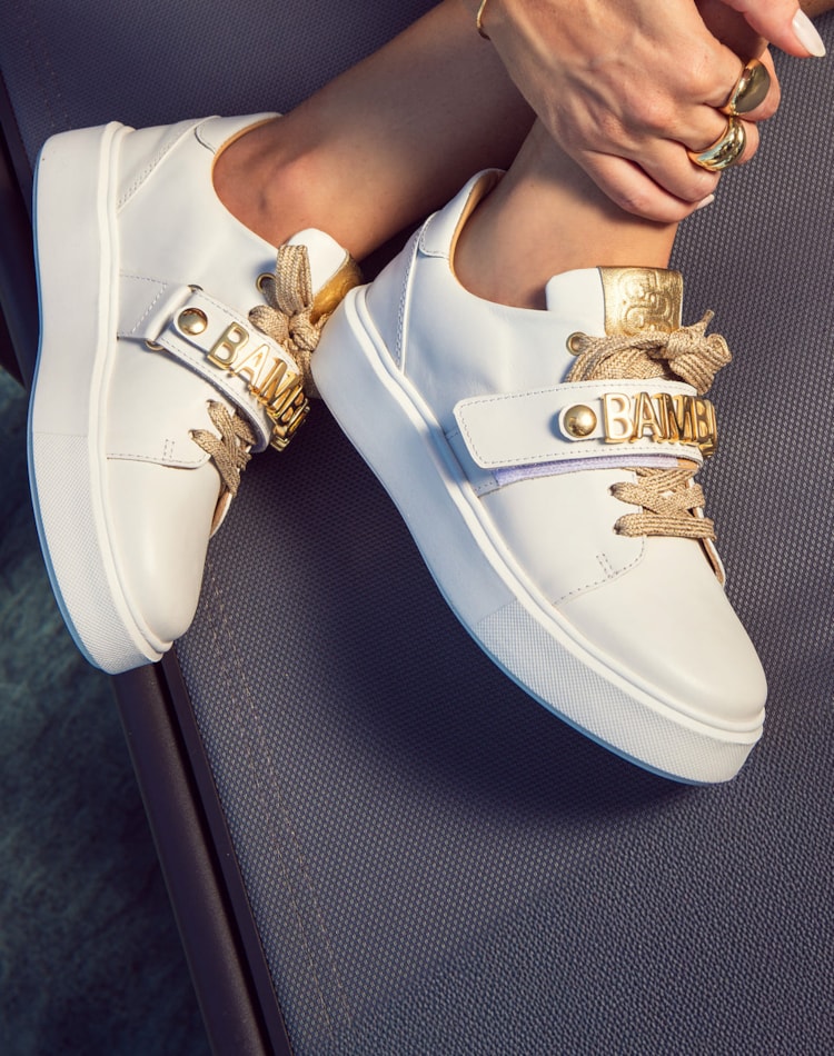 Eleve seu visual com estes tênis plataforma brancos com detalhes dourados. Projetados com cadarços metálicos marcantes e um enfeite banhado a ouro BAMBURI exclusivo, eles oferecem estilo e conforto