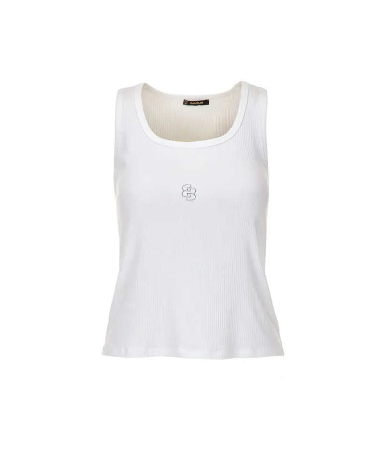 Uma regata justa com nervuras brancas e um logotipo duplo B brilhante adornado com cristais no peito. Sua silhueta minimalista a torna uma peça versátil para usar em camadas, combinando perfeitamente com jaquetas, camisas ou usada sozinha para um visual elegante e clean.