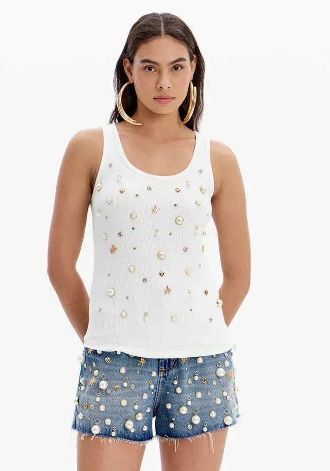 O top em malha canelada possui caimento justo, alças confortáveis e decote redondo. As aplicações de pingentes elevam seu estilo casual, adicionando um toque de elegância ao look. Nada básica!