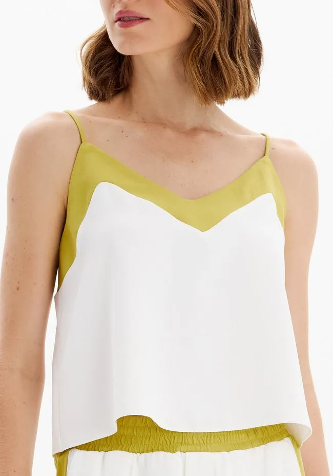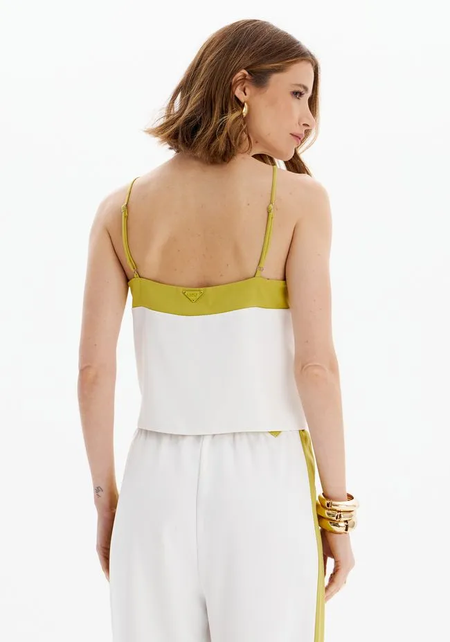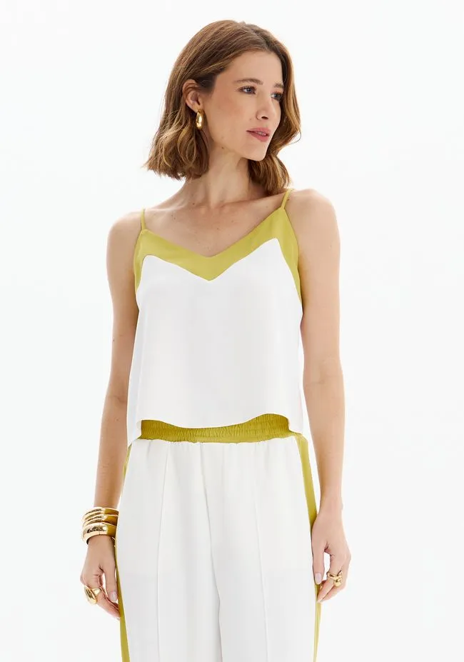Top é feita em crepe com caimento solto e toque sofisticado. Apresenta alças finas com regulador, decote em v e recorte em tom contrastante na parte superior que valoriza a peça com modernidade. A leveza que o seu visual precisa!