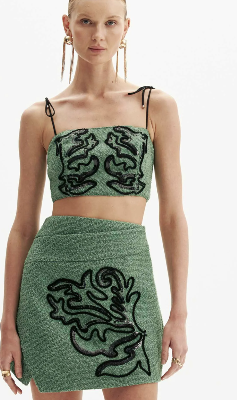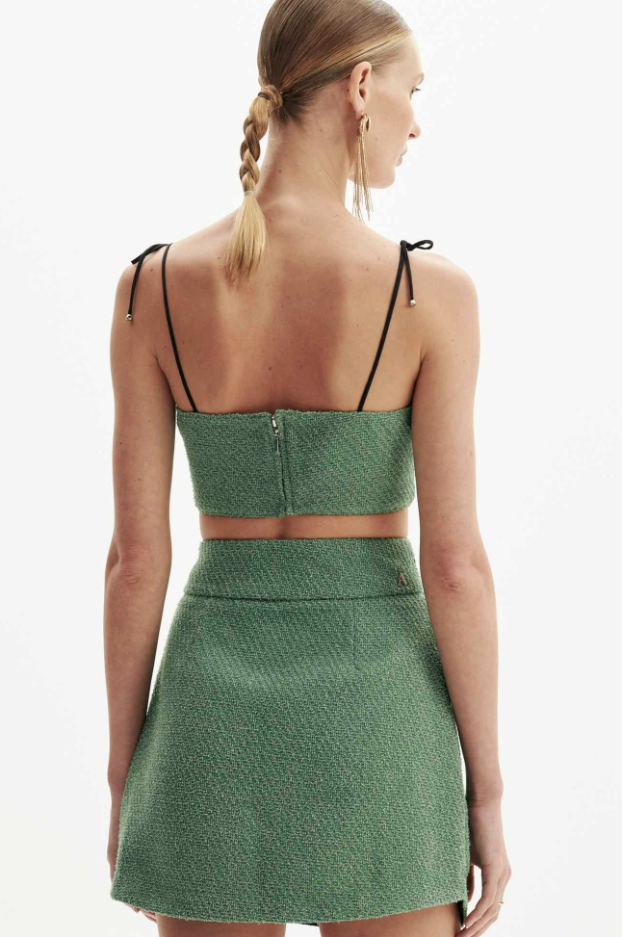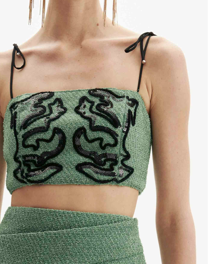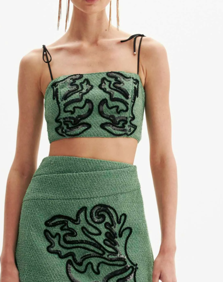top cropped feminino possui zíper posterior e alças finas com amarração para um ajuste personalizado. A textura do tecido e o contraste dos bordados formam a combinação perfeita para adicionar estilo e elegância às suas composições. Invista