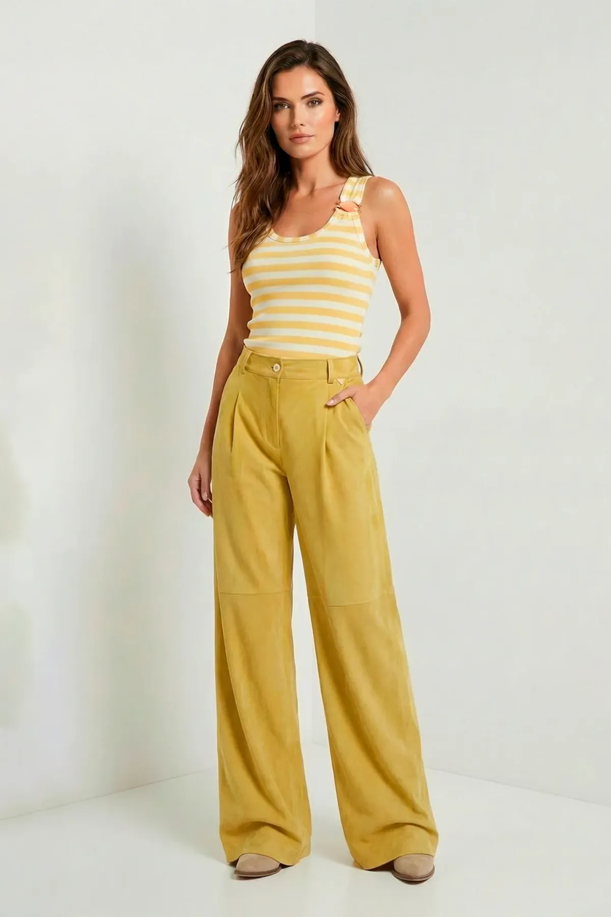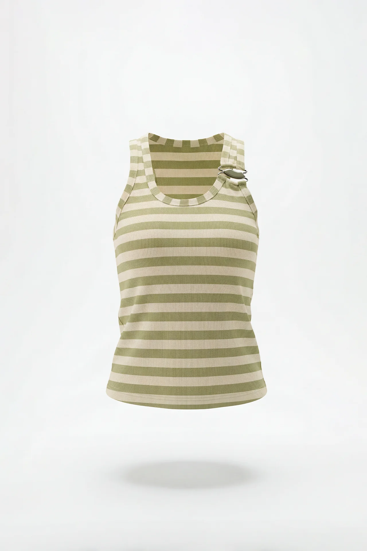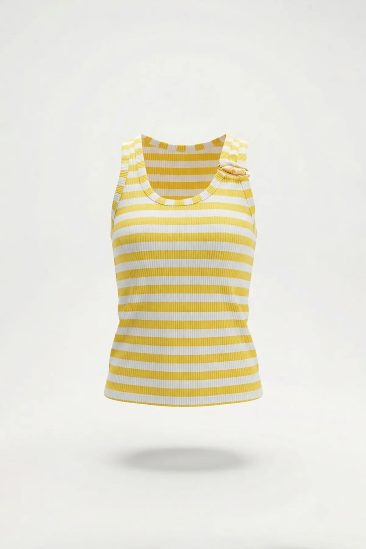 op canelada às riscas sem mangas, confeccionado em fio de algodão, com corte ajustado e decote arredondado. A aplicação metálica no ombro acrescenta um detalhe inesperado e contemporâneo, elevando um essencial do guarda-roupa para looks de impacto subtil.