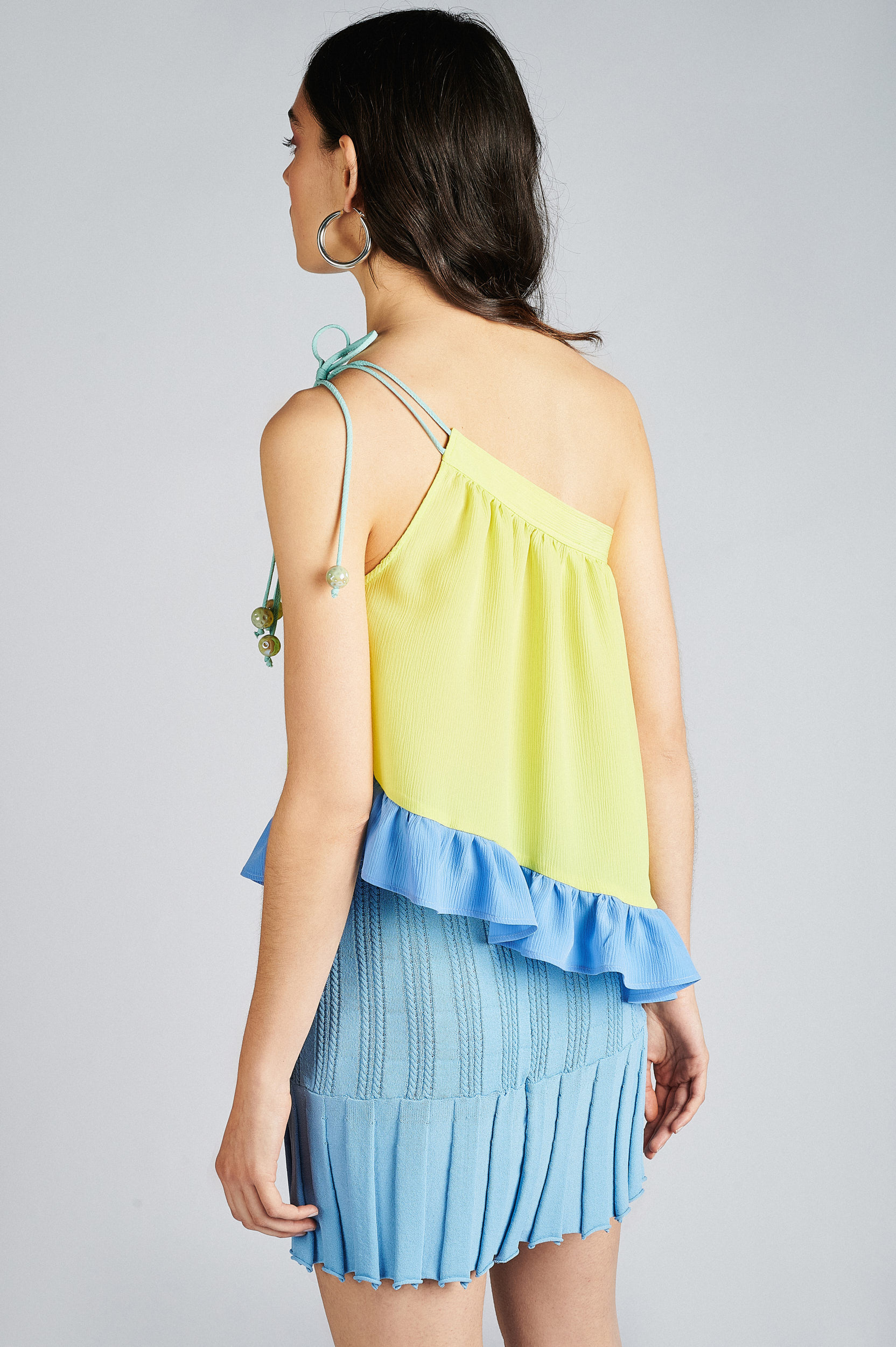 Top de decote assimétrico com alça ajustável mediante cordão. Detalhe de folhos no acabamento a contrastar.