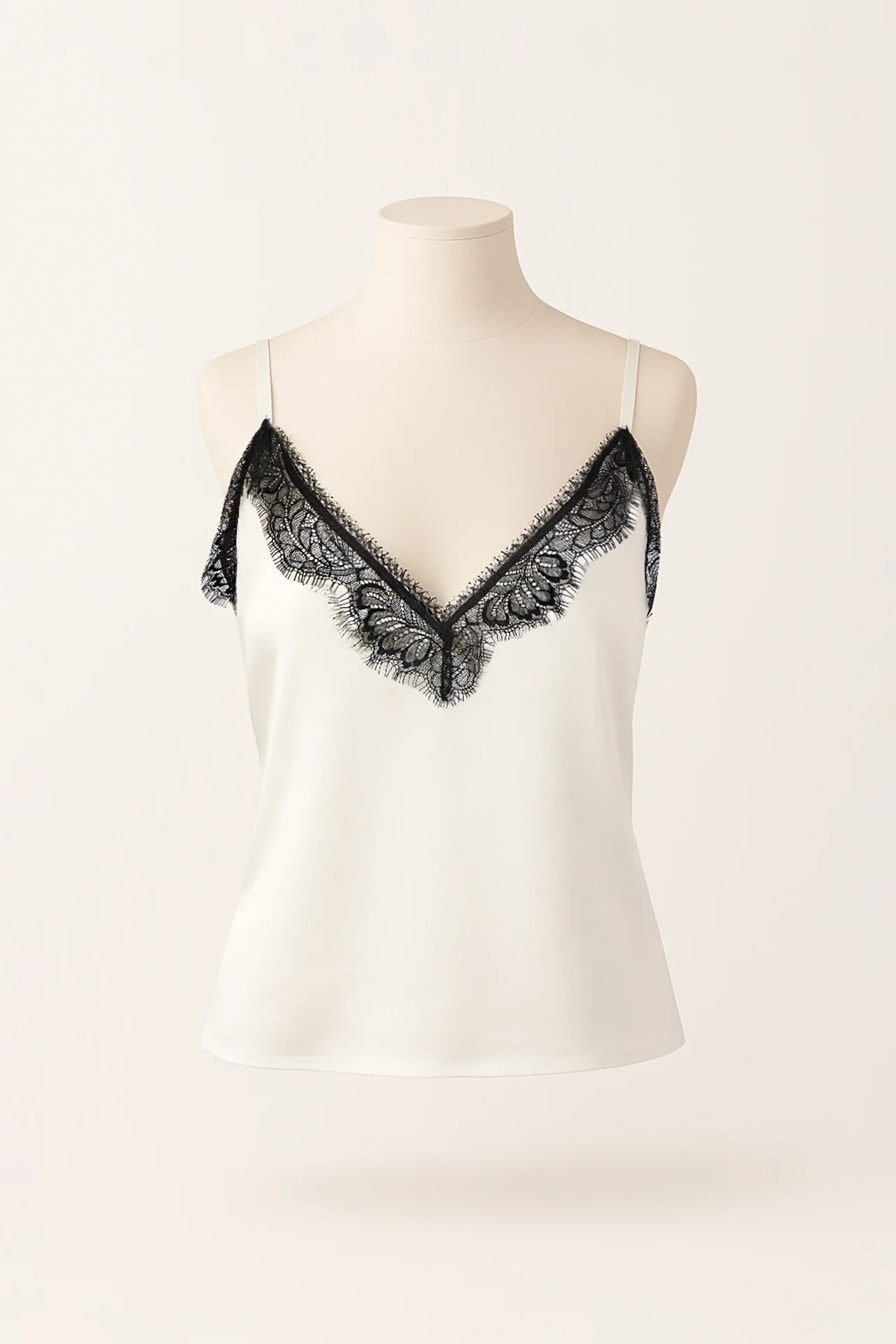 Top em cetim acetinado com aplicação de renda delicada no decote e alças finas ajustáveis. De inspiração lingerie, combina sensualidade e sofisticação num design contemporâneo.