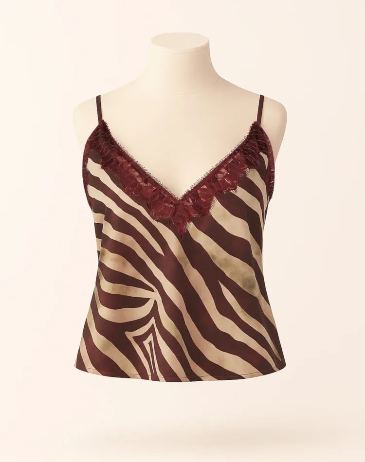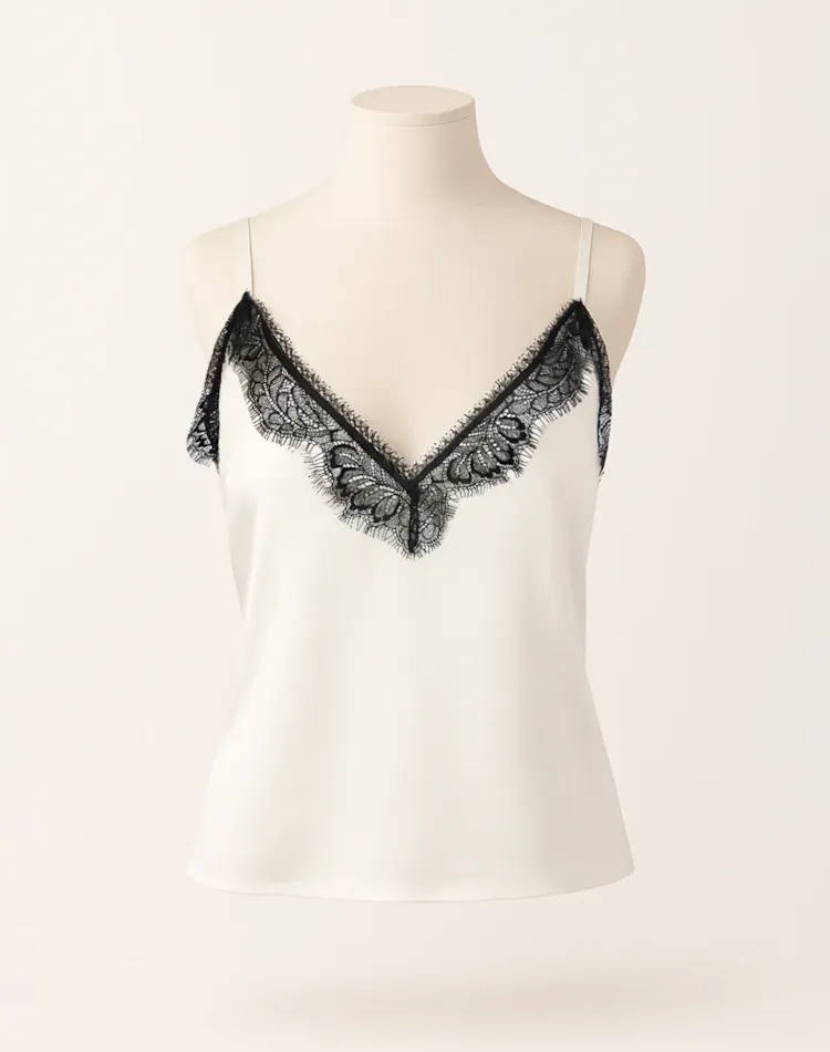 Top em cetim acetinado com aplicação de renda delicada no decote e alças finas ajustáveis. De inspiração lingerie, combina sensualidade e sofisticação num design contemporâneo.