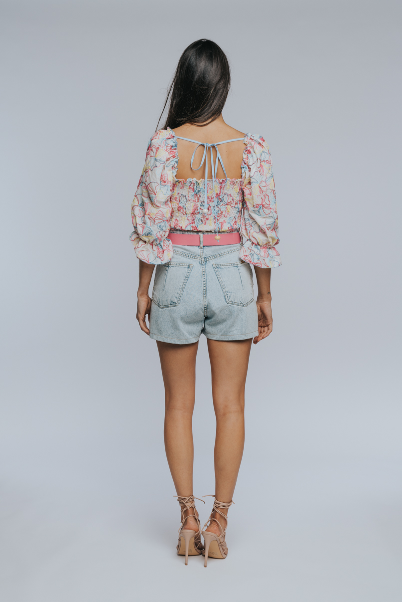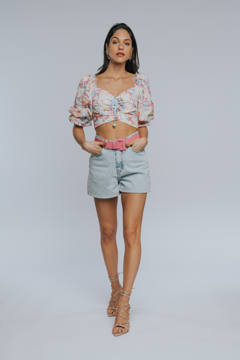 Top cropped com decote em bico. Mangas abaloadas por baixo do cotovelo com efeito folho no seu término. Cós elástico atrás. Pormenor de atilhos contrastantes com borlas.