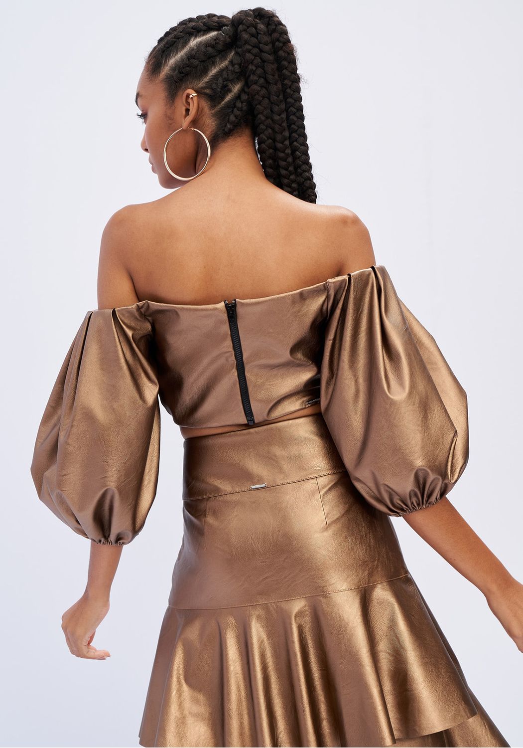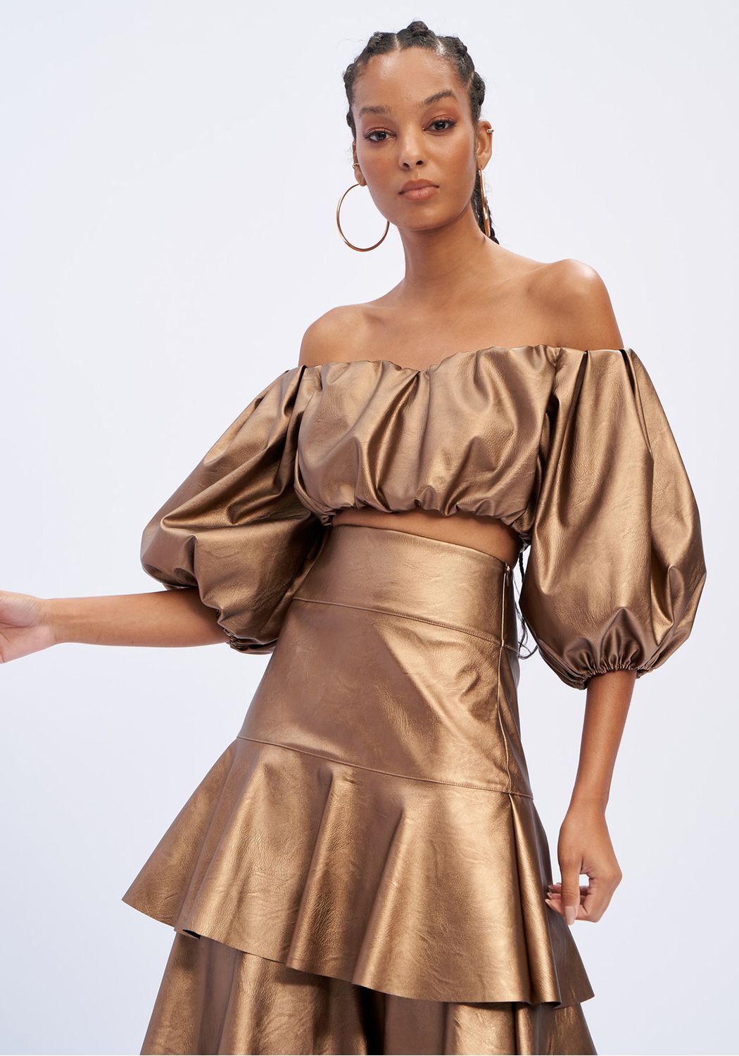 Top em ecopele dourada, possui decote ombro a ombro e mangas balão