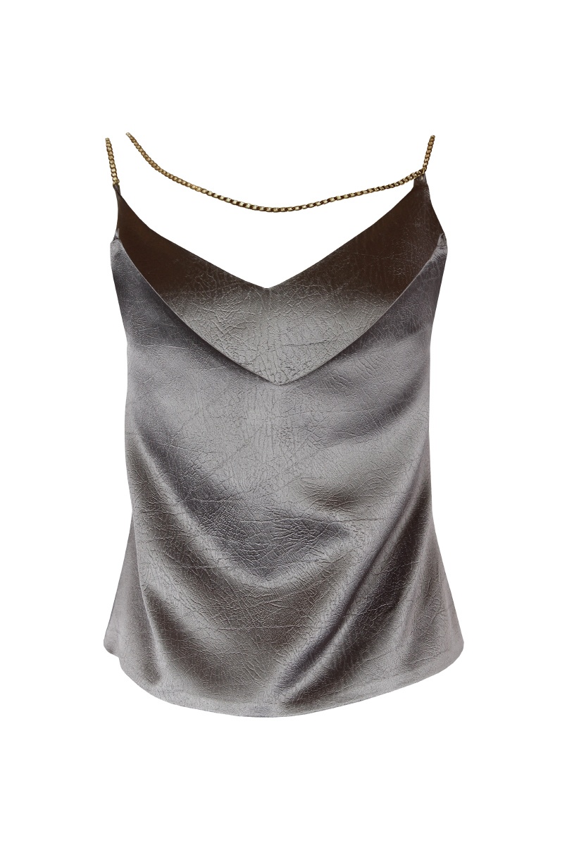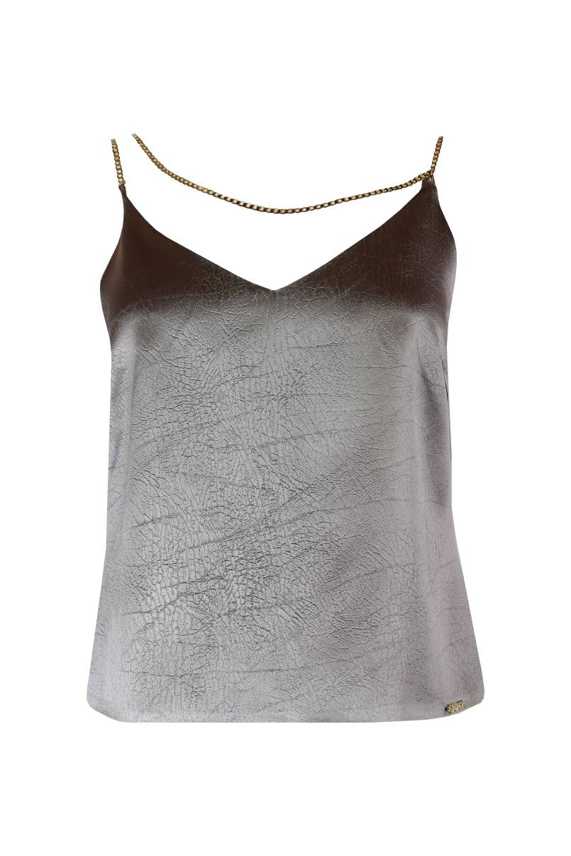 Top acetinado com decote em bico.