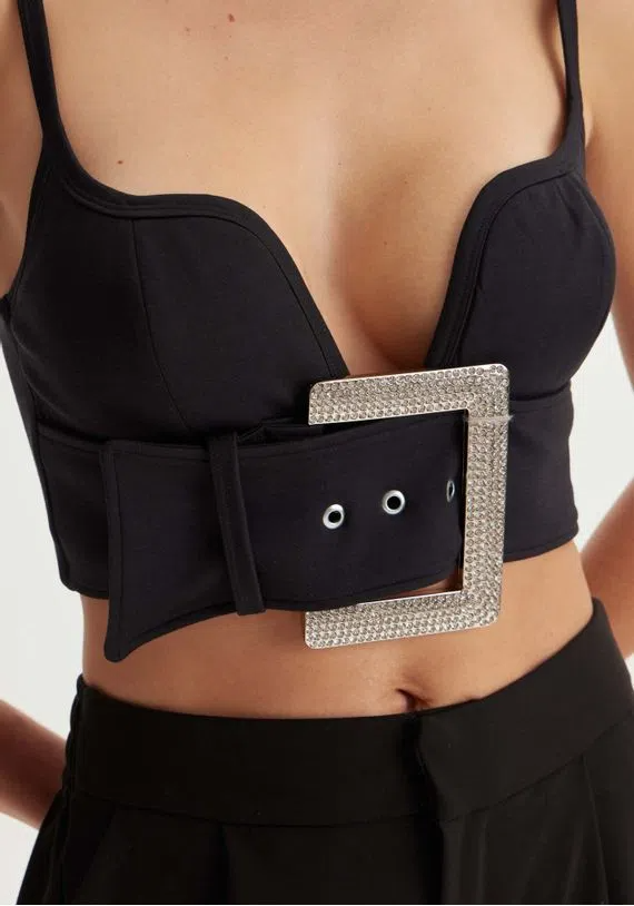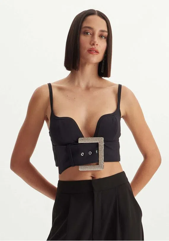 TOP DE ALÇAS COM MAXI FIVELA É PERFEITO PARA ACOMPANHAR DIVERSAS PRODUÇÕES. ALÉM DO CAIMENTO JUSTO, A PEÇA POSSUI MODELAGEM CROPPED, DECOTE V E DETALHES EM STRASS QUE GARANTEM VISUAL ÚNICO. APOSTE EM LOOKS NOTURNOS E ALL BLACK.