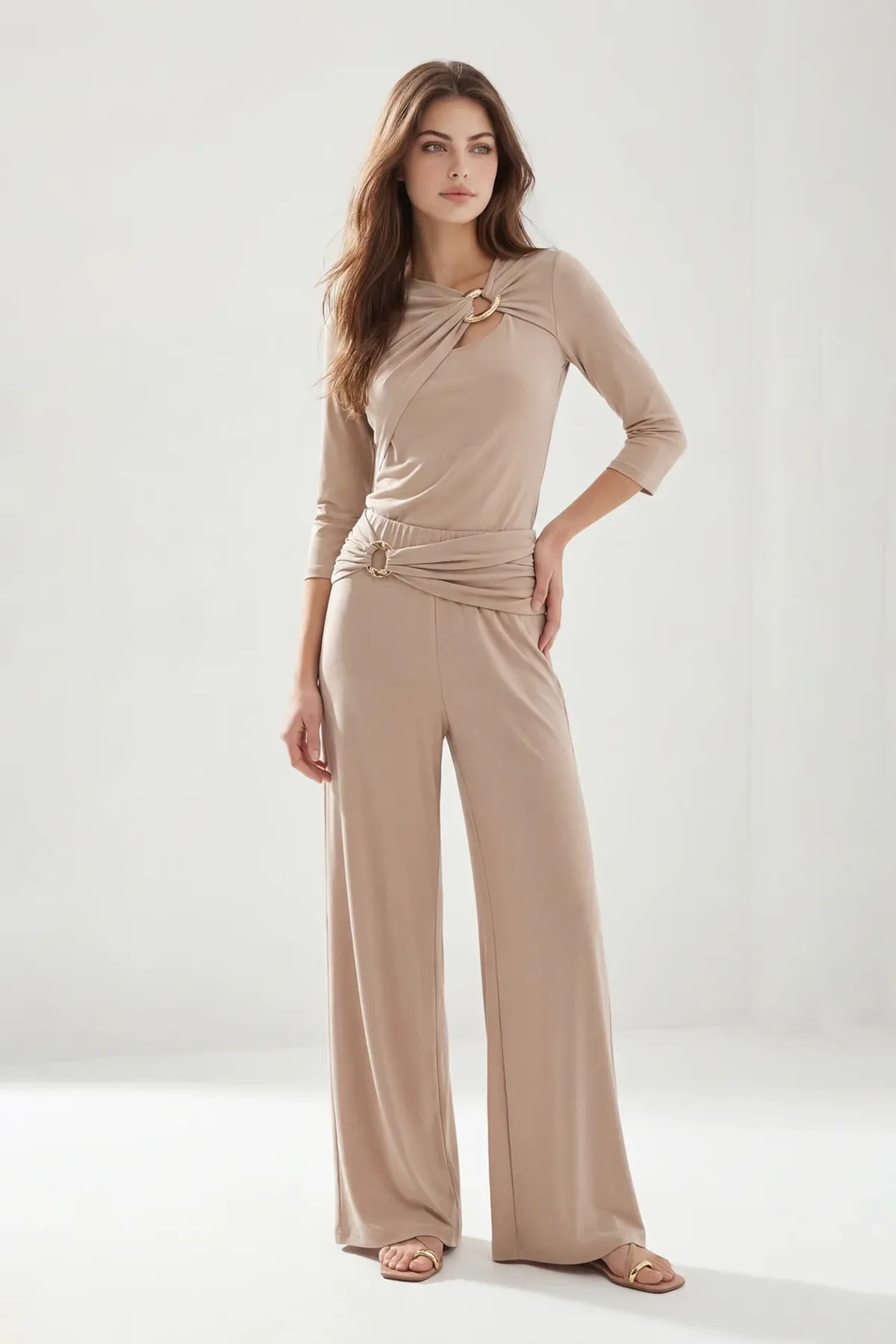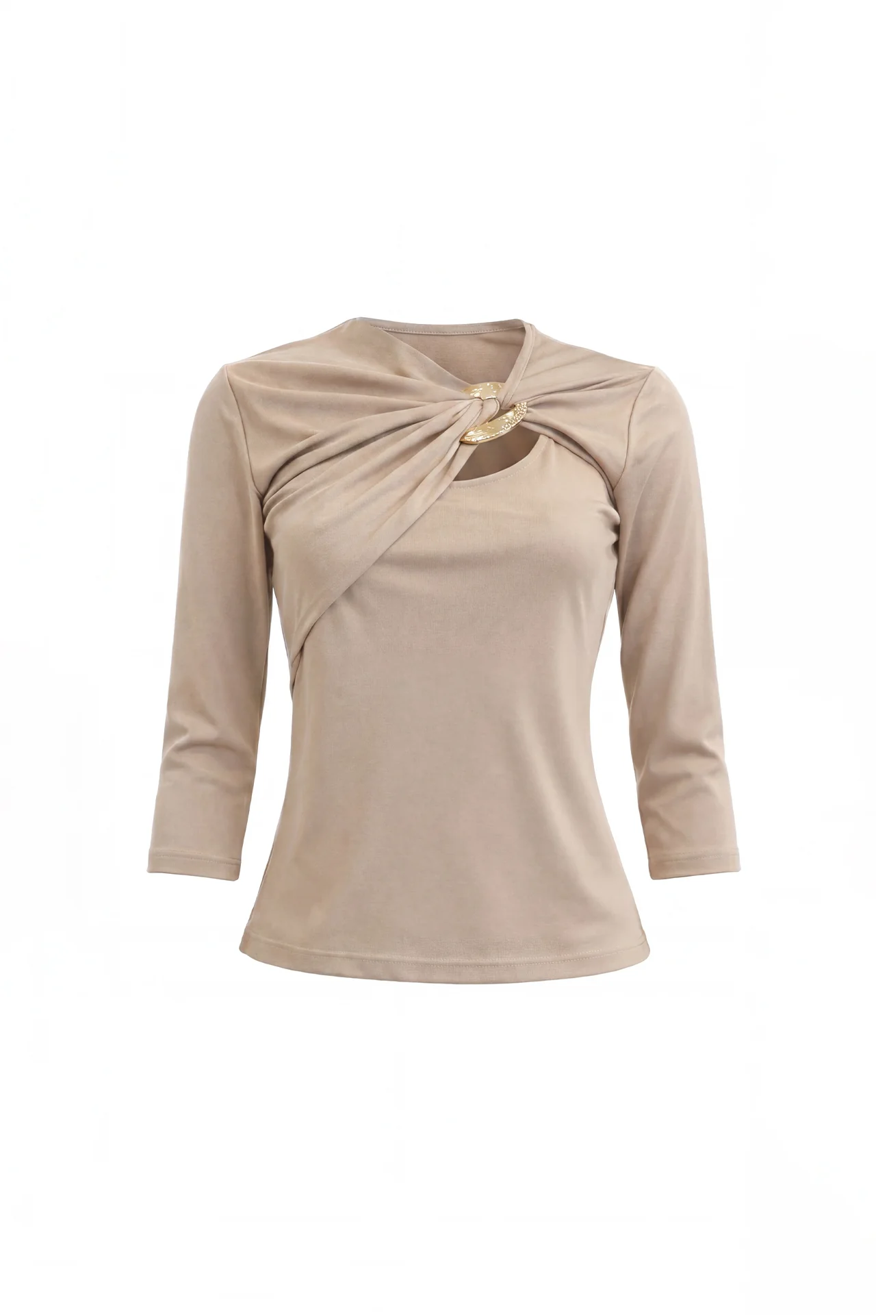 Top de manga comprida 3/4 com construção drapeada e detalhe de argola metálica no decote, criando um recorte subtil que valoriza a linha dos ombros. O encaixe ajustado e o tecido de toque macio garantem um cair limpo e confortável.