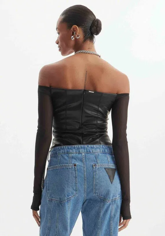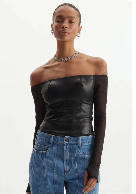 TOP CURTA CONFECCIONADA EM PU É PERFEITA PARA CRIAR LOOKS ALL BLACK. COM DECOTE OMBRO A OMBRO, RECORTES E MANGAS LONGAS TRANSPARENTES, A PEÇA POSSUI CAIMENTO JUSTO QUE VALORIZA A SILHUETA. APOSTE NA ESTÉTICA STREETWEAR.