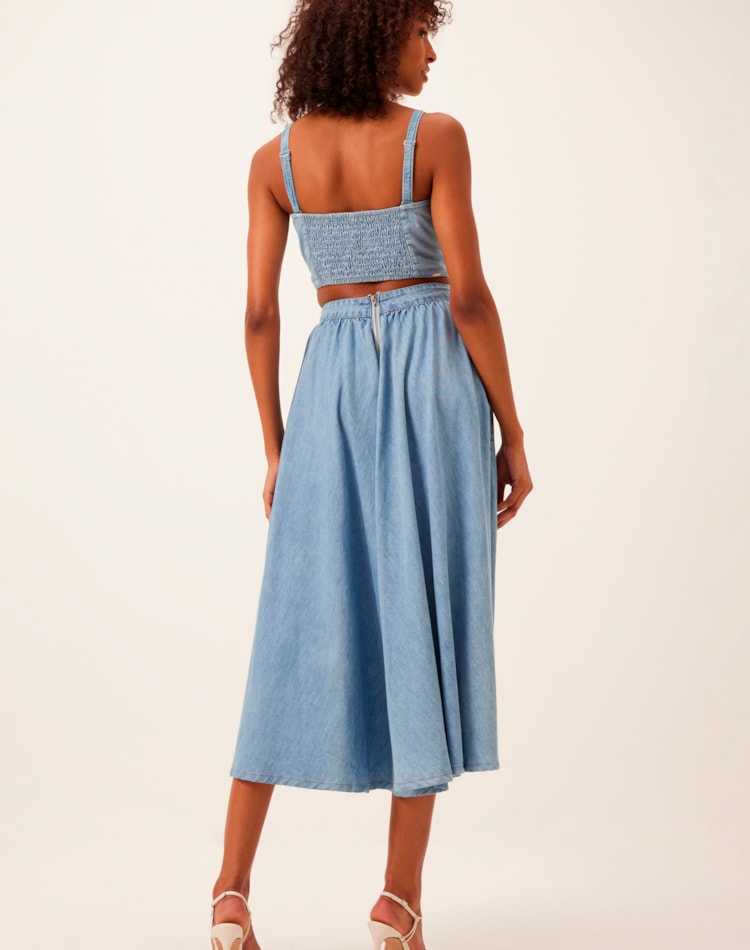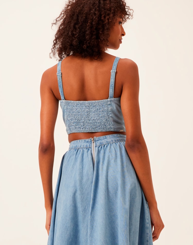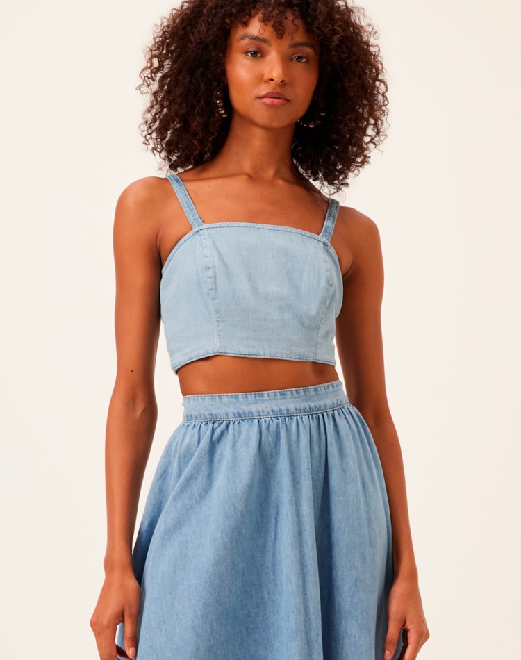 top jeans feminino versátil e elegante? conheça o top jeans fino com alças removíveis da dimy, este top é perfeito para compor diversos looks, seja casual ou mais sofisticado. suas alças removíveis possibilitam diferentes estilos de uso.