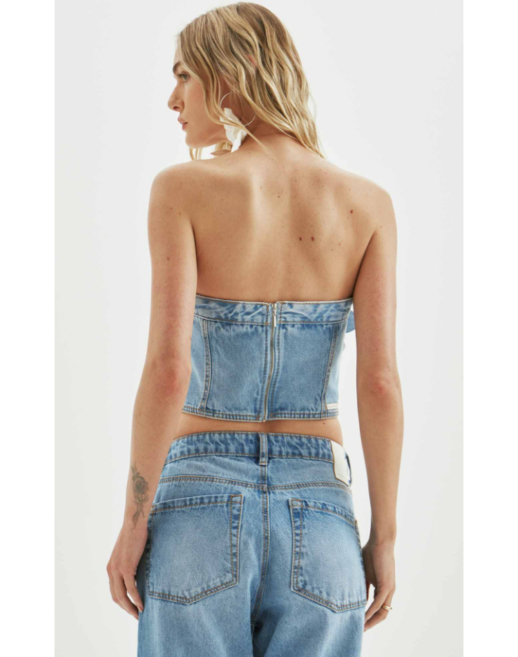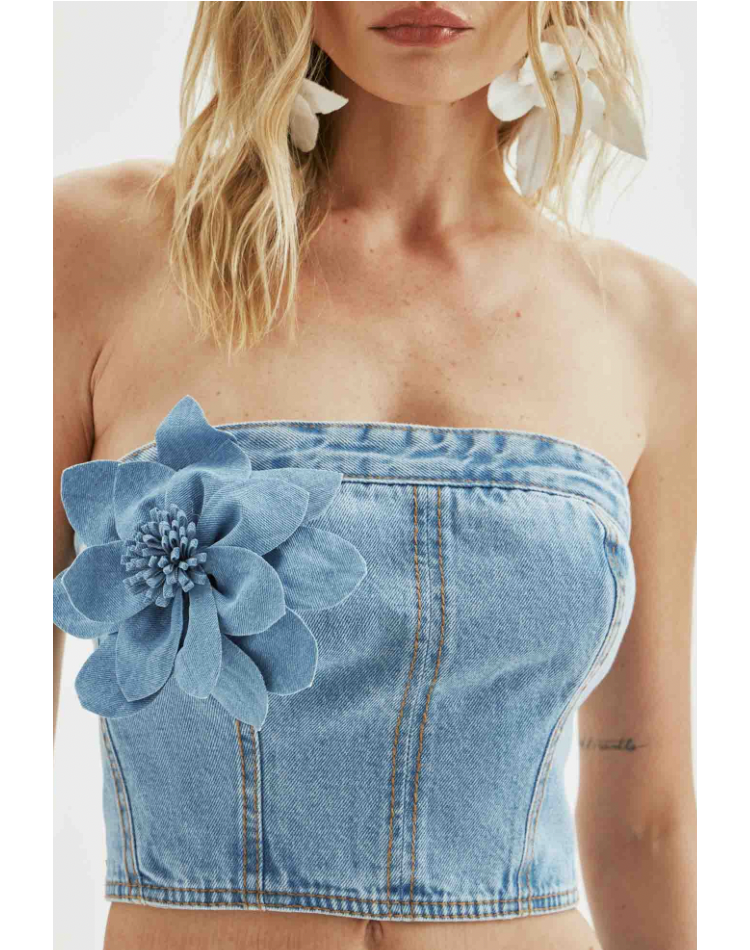 O top jeans é uma peça versátil e atemporal. Apresenta decote tomara que caia, modelagem cropped e conta com aplicação de flor, uma tendência fashion. Aposte!