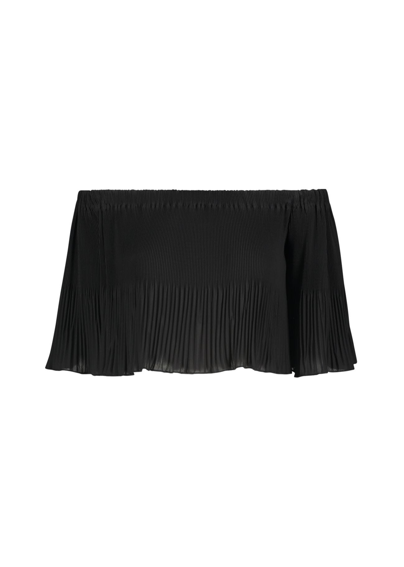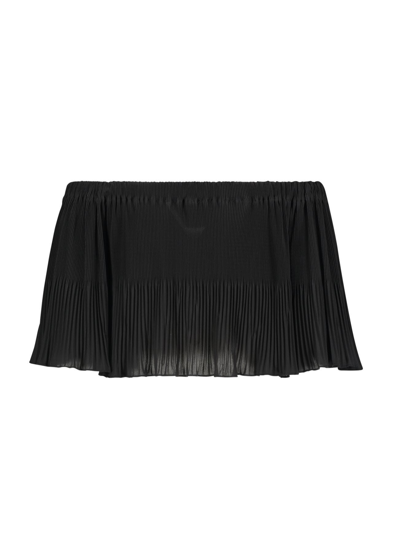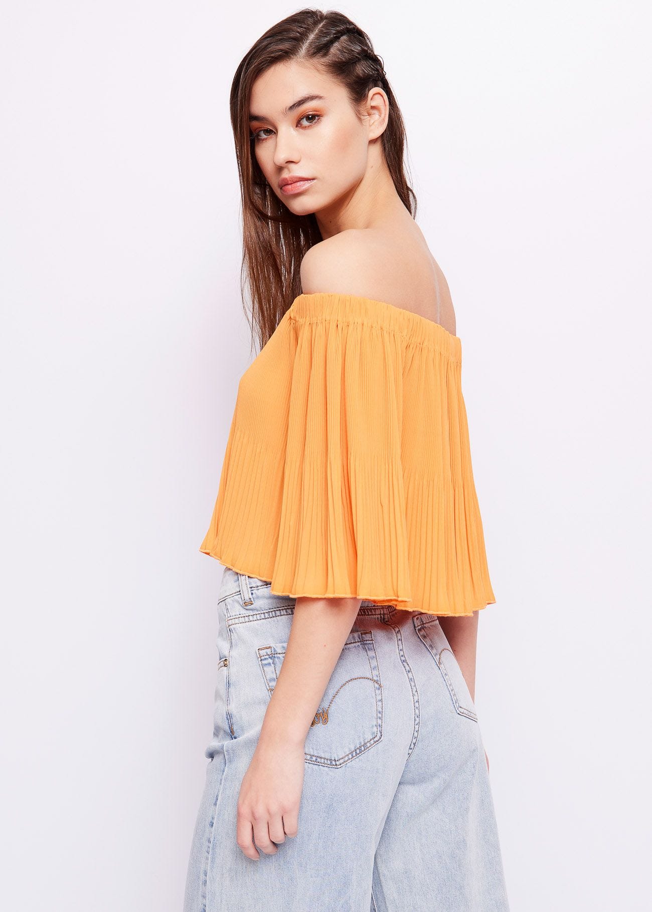 Top em tecido fluido com padrão plissado. Possui decote ombro a ombro com elástico.