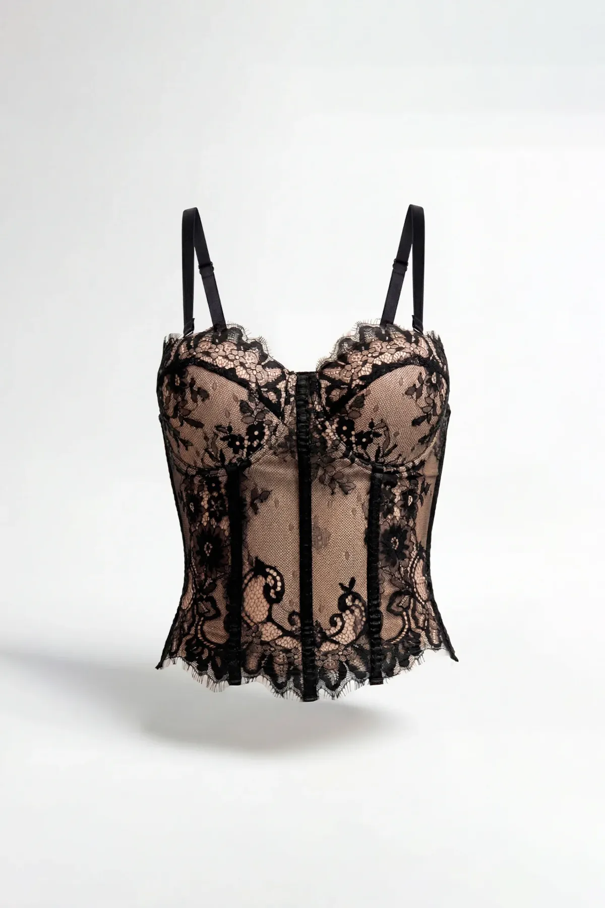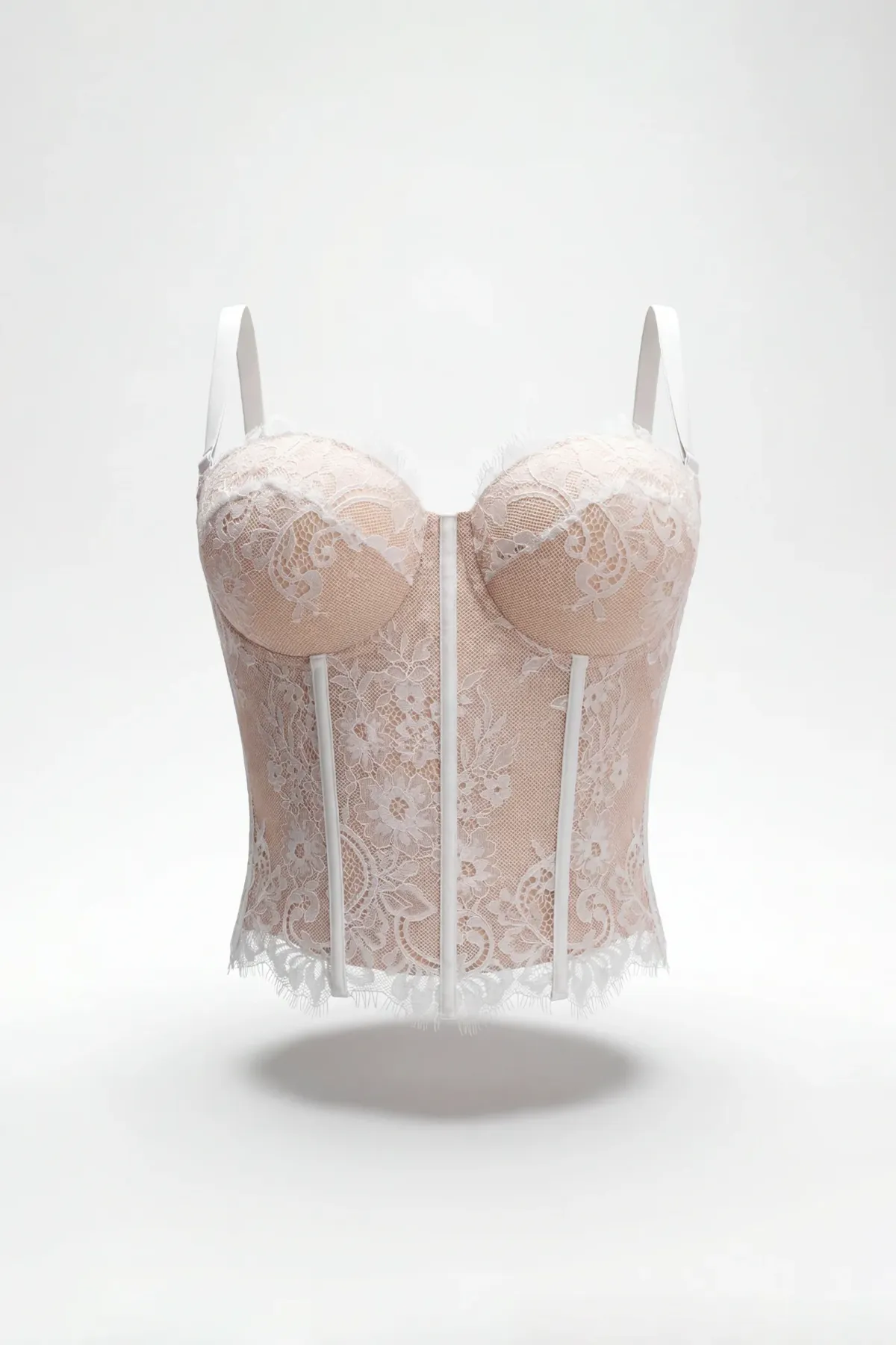 Top corpete pensado como peça-chave: estrutura marcada, copas moldadas e renda aplicada com transparência subtil. As barbatanas internas definem a silhueta sem perder leveza, enquanto o acabamento rendado remata o decote com delicadeza. Fecha com colchetes.