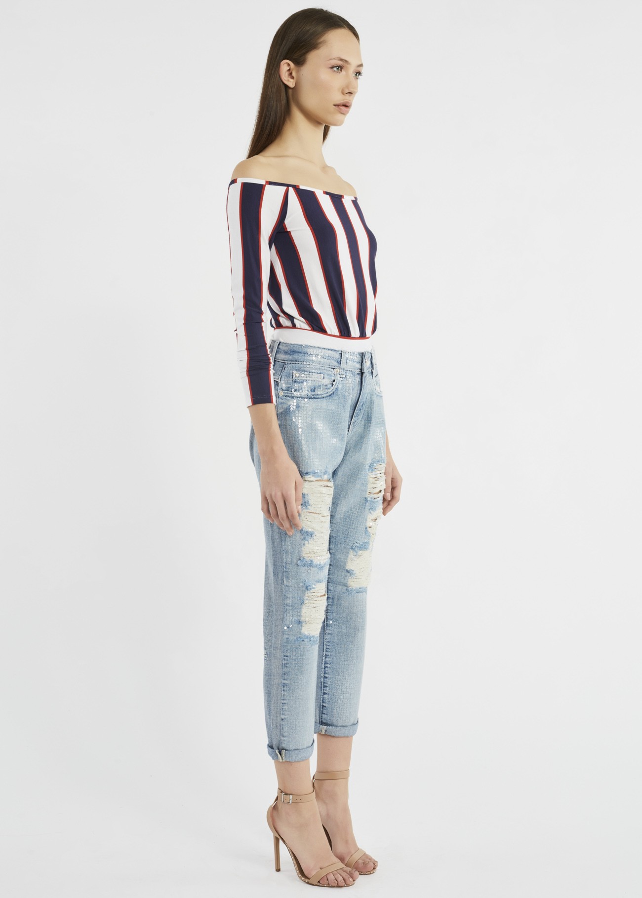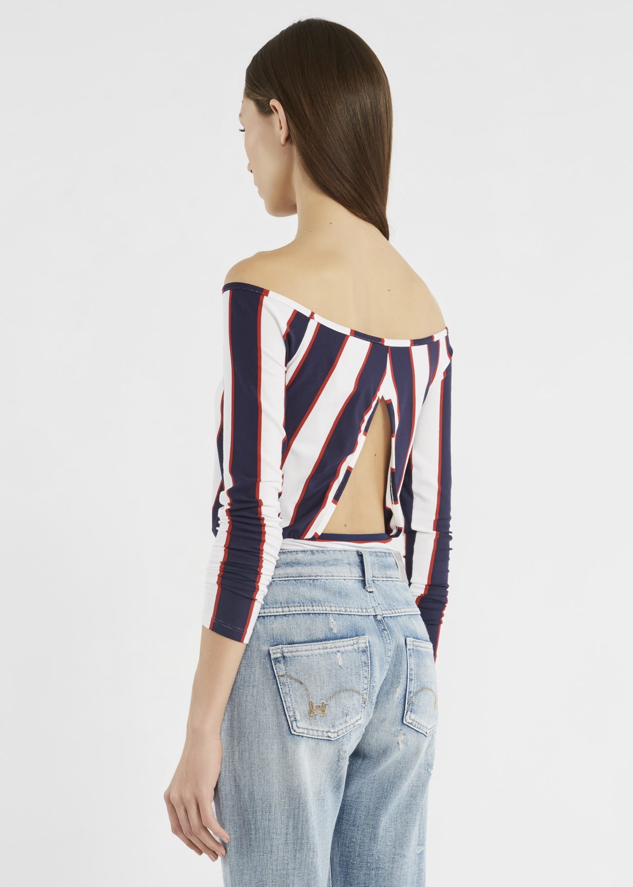 Top com estampado gráfico às riscas, decote em barco e mangas compridas. A peça tem comprimento recortado, cós alto que embeleza a figura e recorte nas costas.