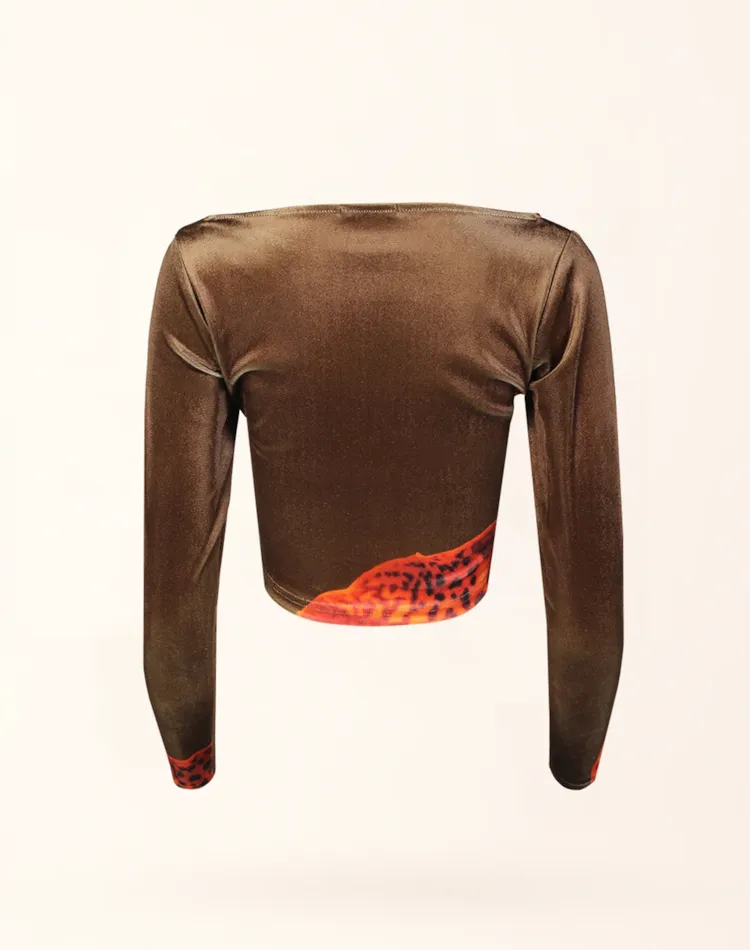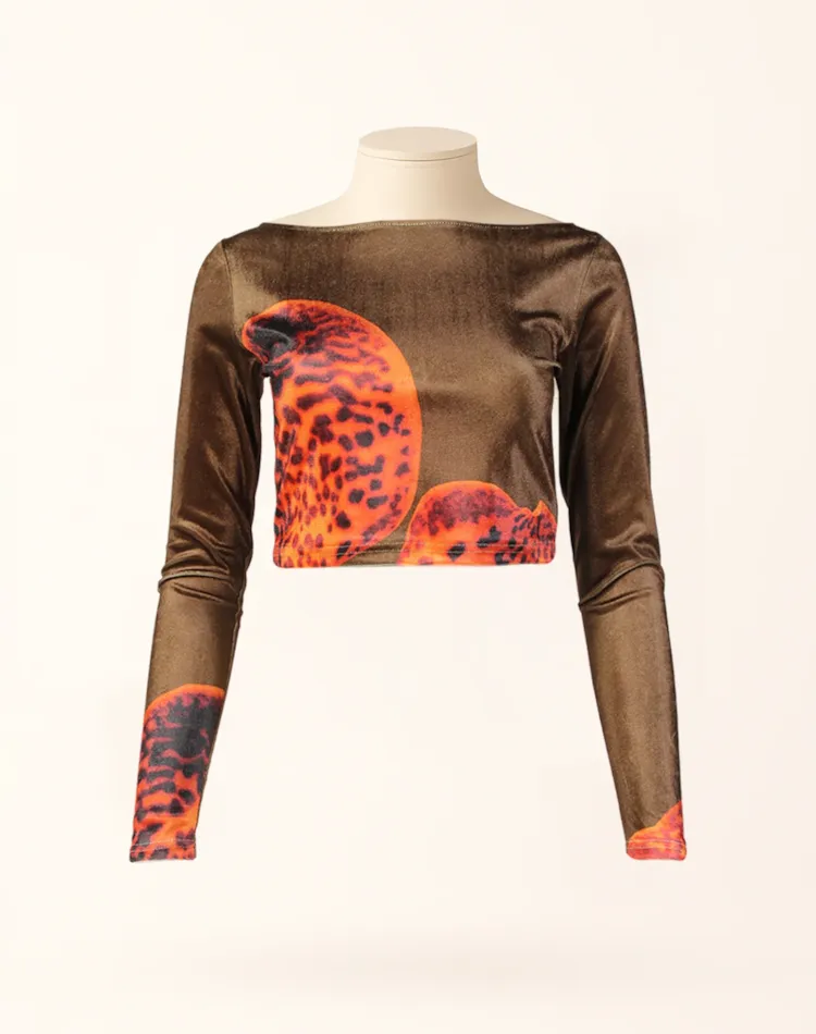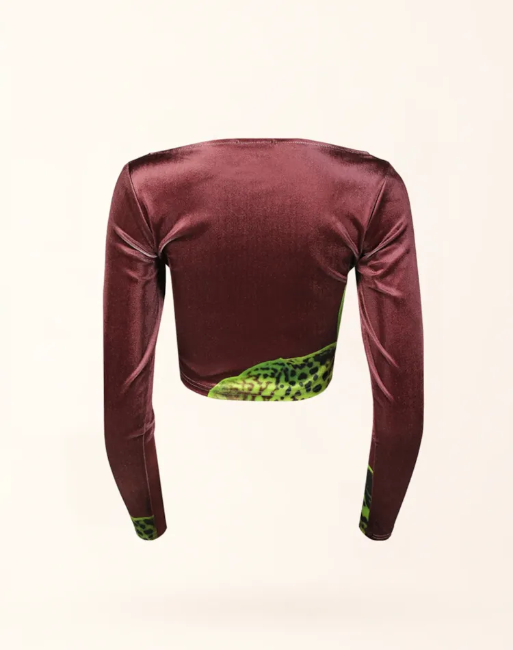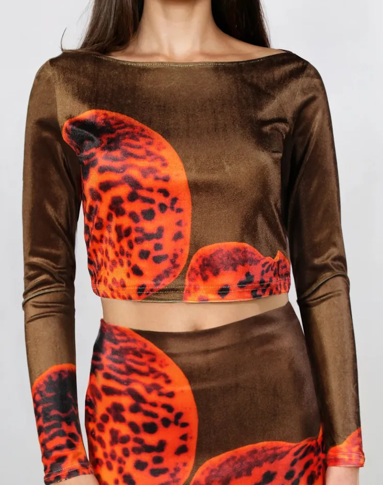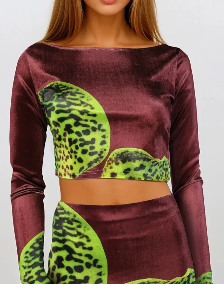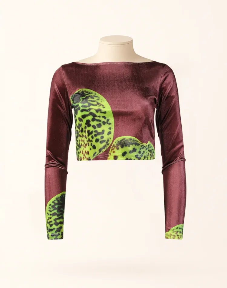 Top em veludo de textura suave, com estampa de orquídea em contraste intenso. O design justo e de linhas puras equilibra sensualidade e modernidade, criando uma peça de impacto visual e refinamento subtil.