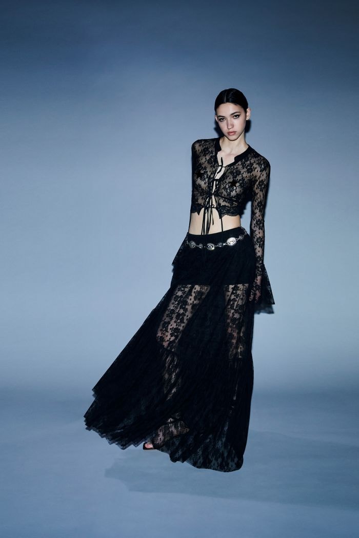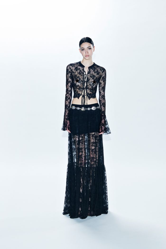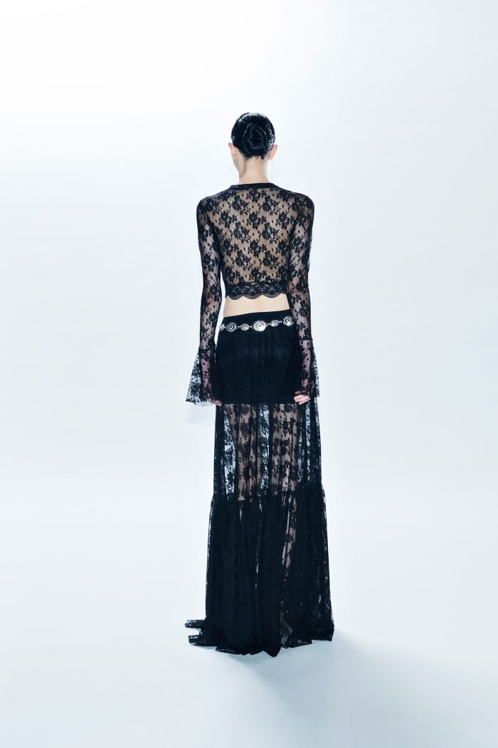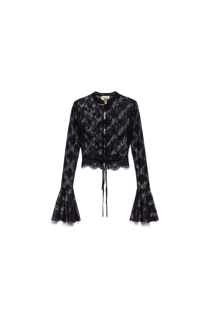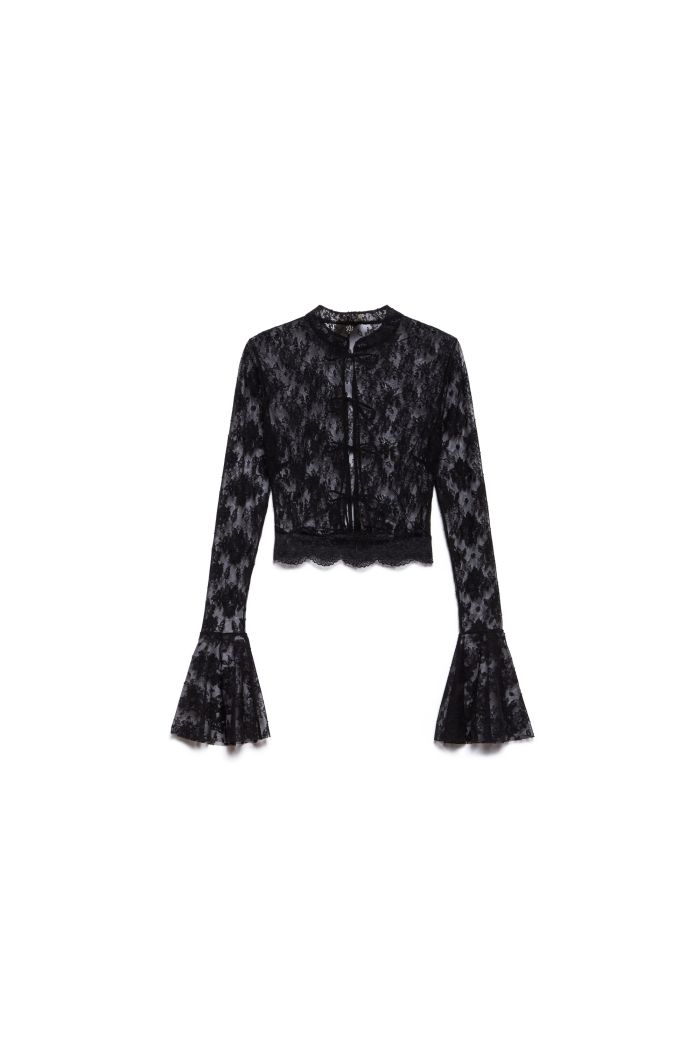 Blusa cropped de renda transparente com mangas compridas e punhos alargados.