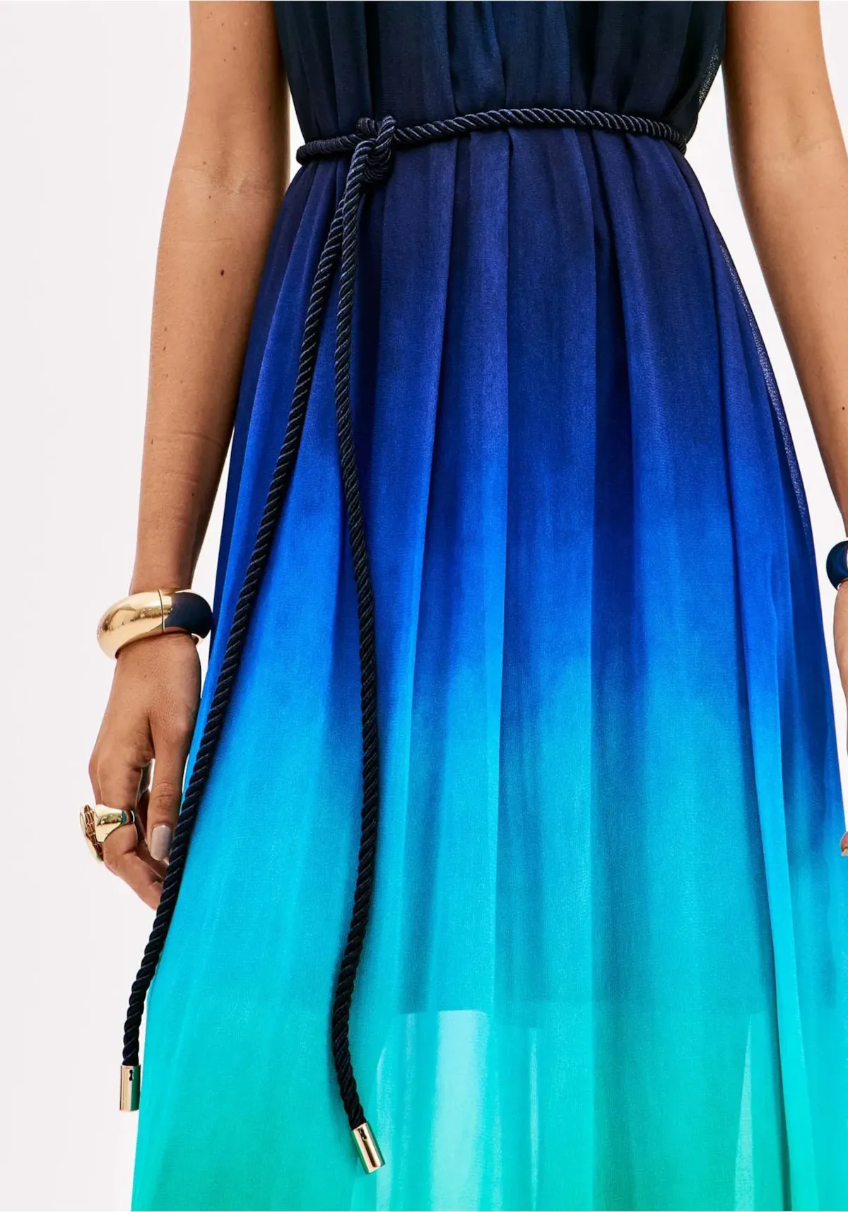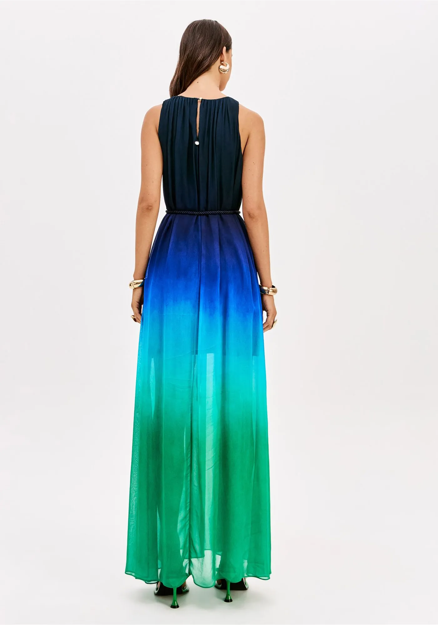 O vestido longo é confeccionado em chiffon, um tecido leve, fluido e com transparência sutil. apresenta forro parcial, decote redondo, caimento amplo e fechamento posterior por botão. O cinto em cordão acompanha a peça para variações de estilo. Aposte!