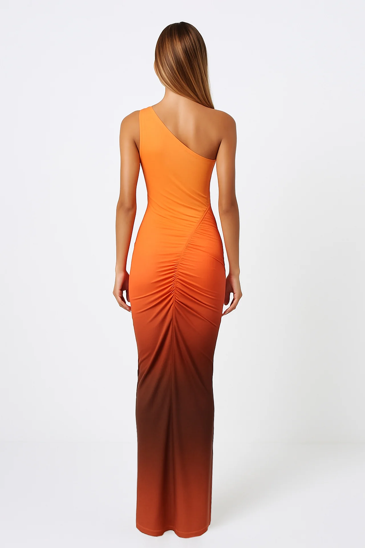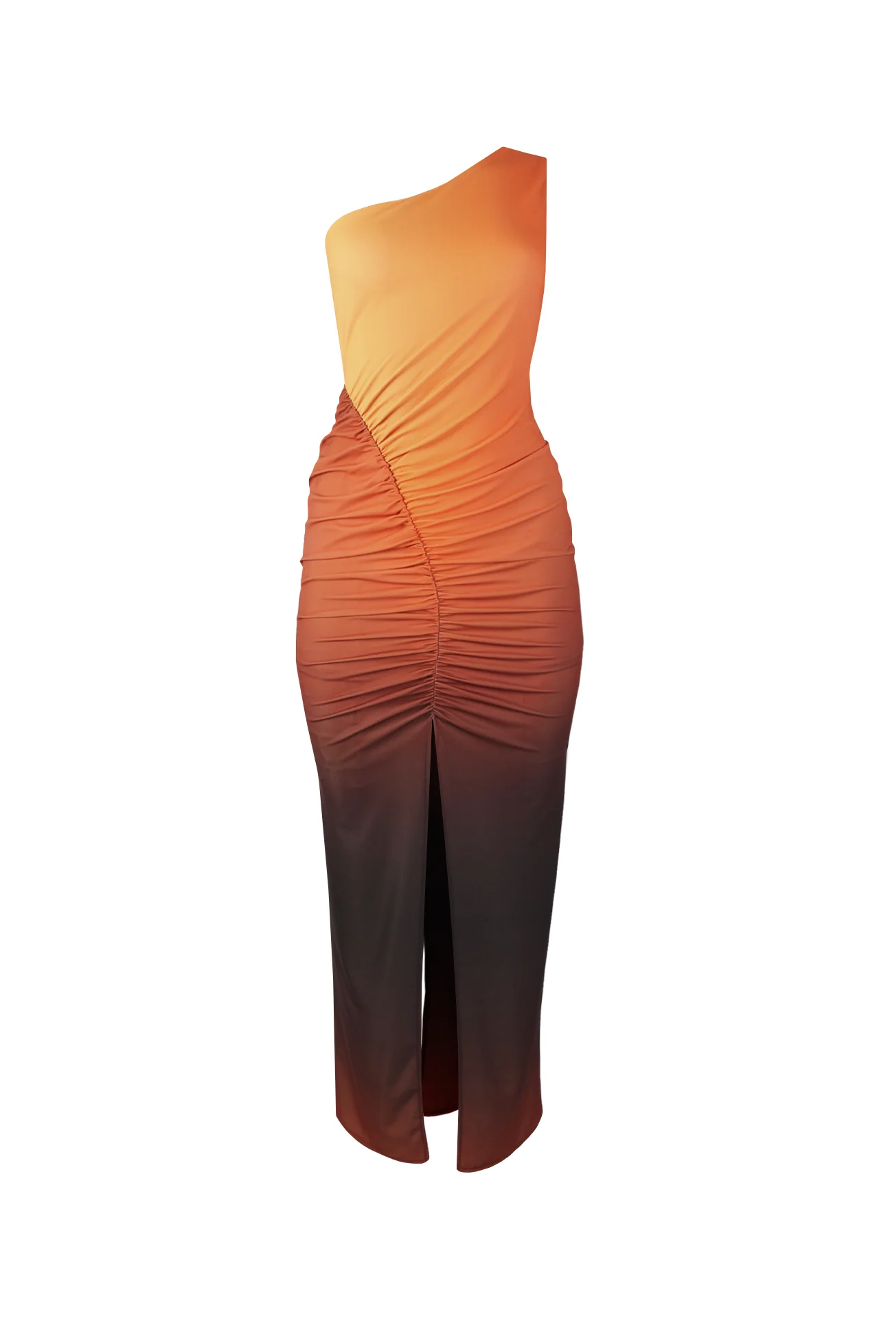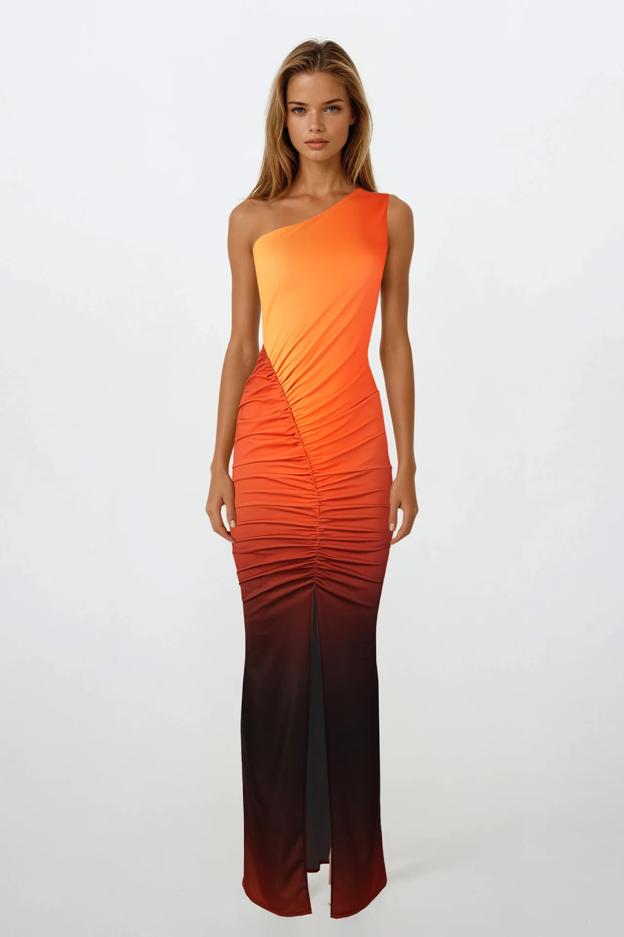 Este vestido de corte assimétrico, com drapeado estratégico e uma elegante racha frontal, destaca-se pelo seu movimento fluido e silhueta escultural.