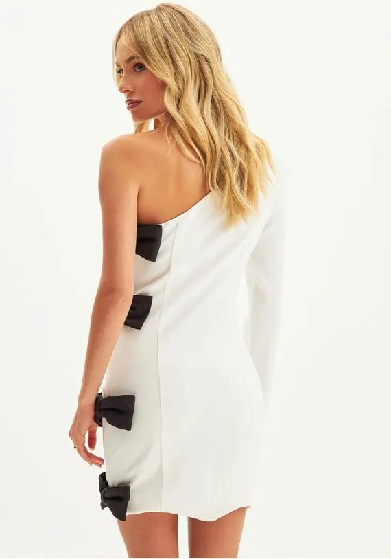 vestido curto é estruturado e possui decote assimétrico. Possui apenas uma manga com ombreira e traz a tendência da estação aplicados na lateral do vestido: os laços. Aposte nessa trend e arrase