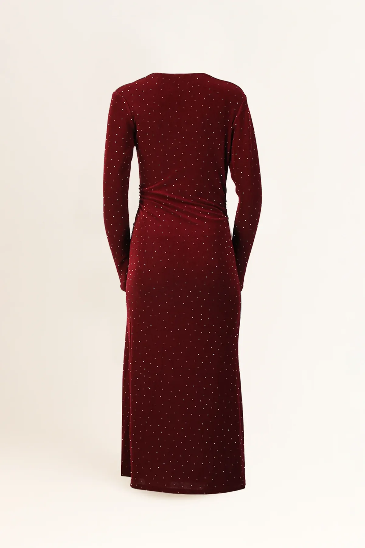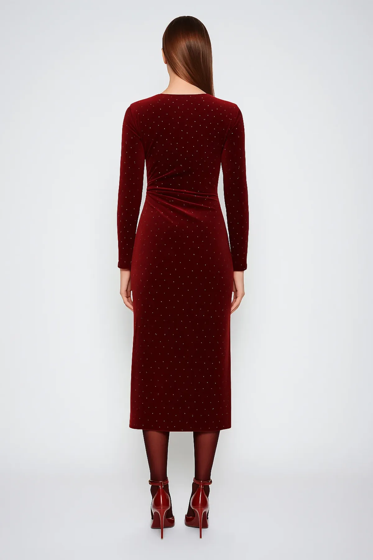 Vestido midi em malha aveludada luminosa com microbrilhos finos aplicados por toda a superfície. O decote assimétrico revela um dos ombros, enquanto as pregas laterais estratégicas moldam suavemente o corpo sem restringir. A construção da peça valoriza o movimento e garante conforto, mesmo em silhueta mais próxima do corpo.