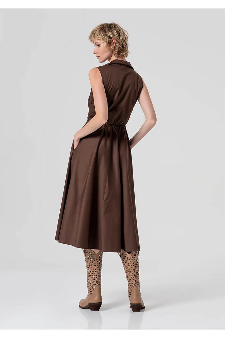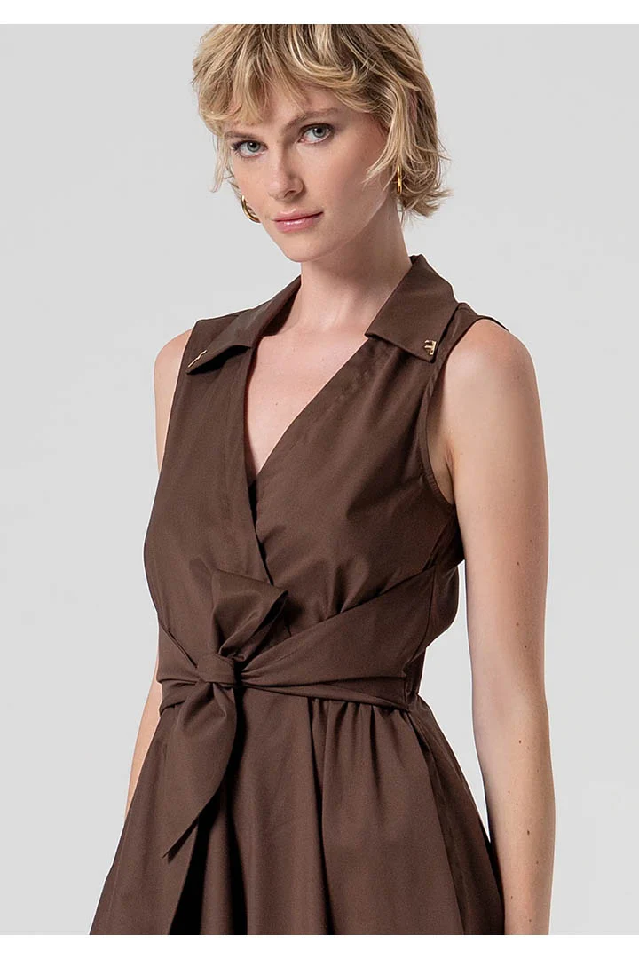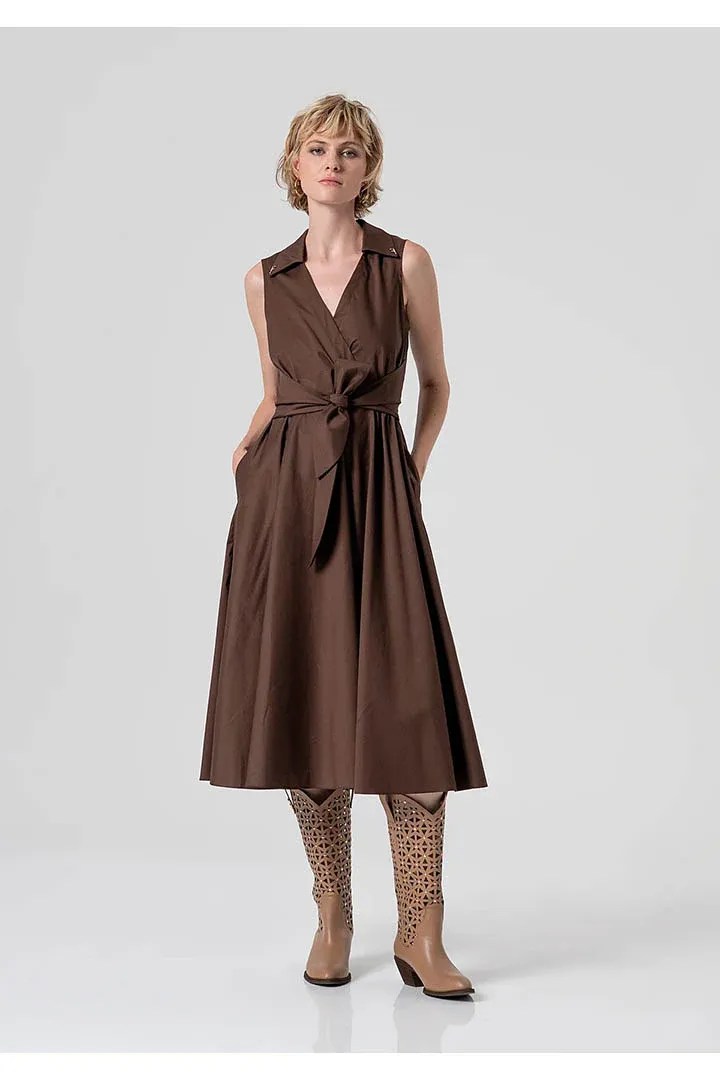 Vestido midi sem mangas em popeline. Decote quadrado com amarração no pescoço, botões centrais para abertura, faixa na cintura, bolsos laterais e saia ampla.