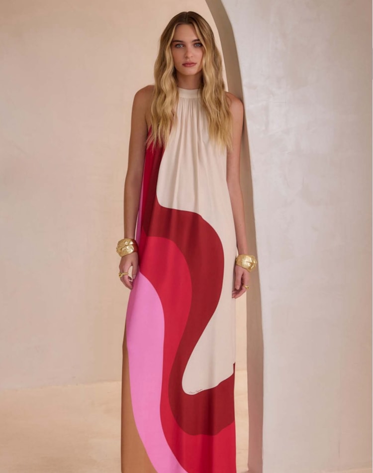 O vestido longo estampado sem mangas é a peça ideal para um visual leve e cheio de estilo. Com design elegante, caimento descolado e estampa marcante, traz frescor e personalidade à produção