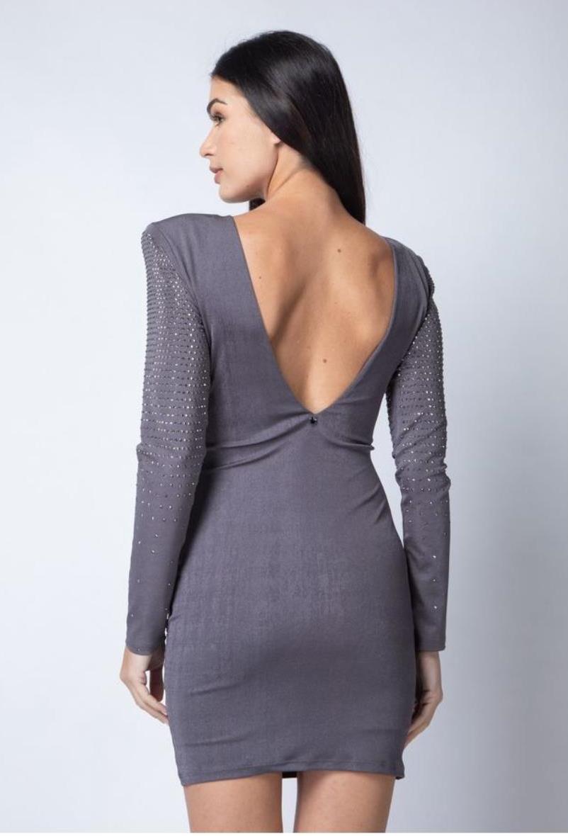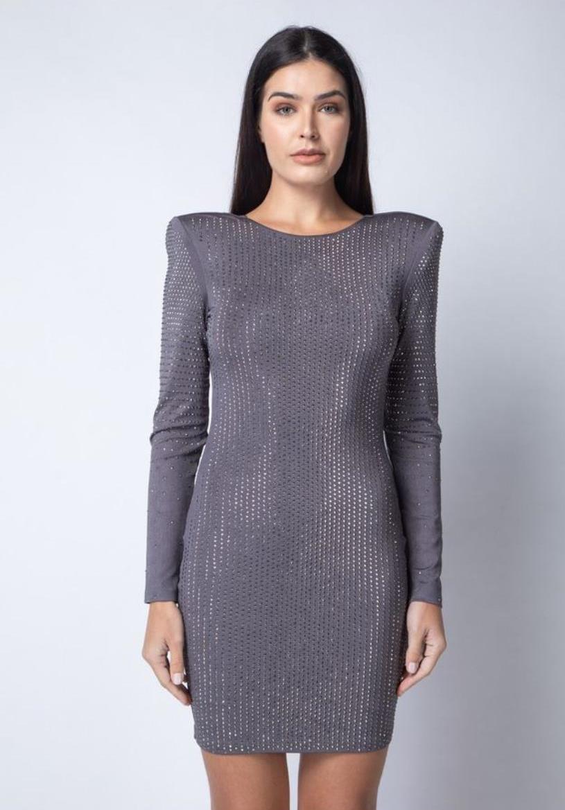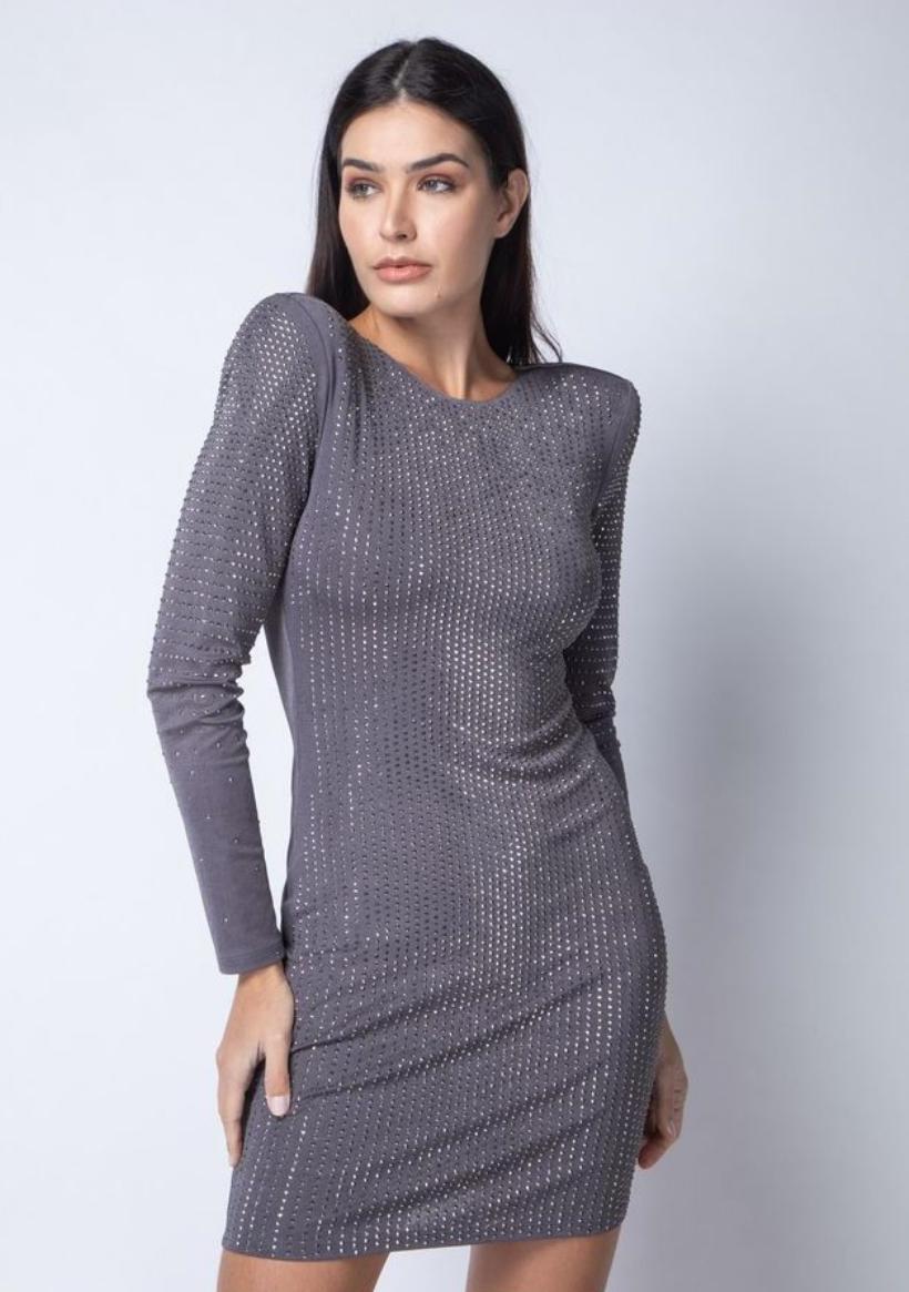 Vestido curto justo de manga comprida de cor cinza e com aplicações de brilhantes