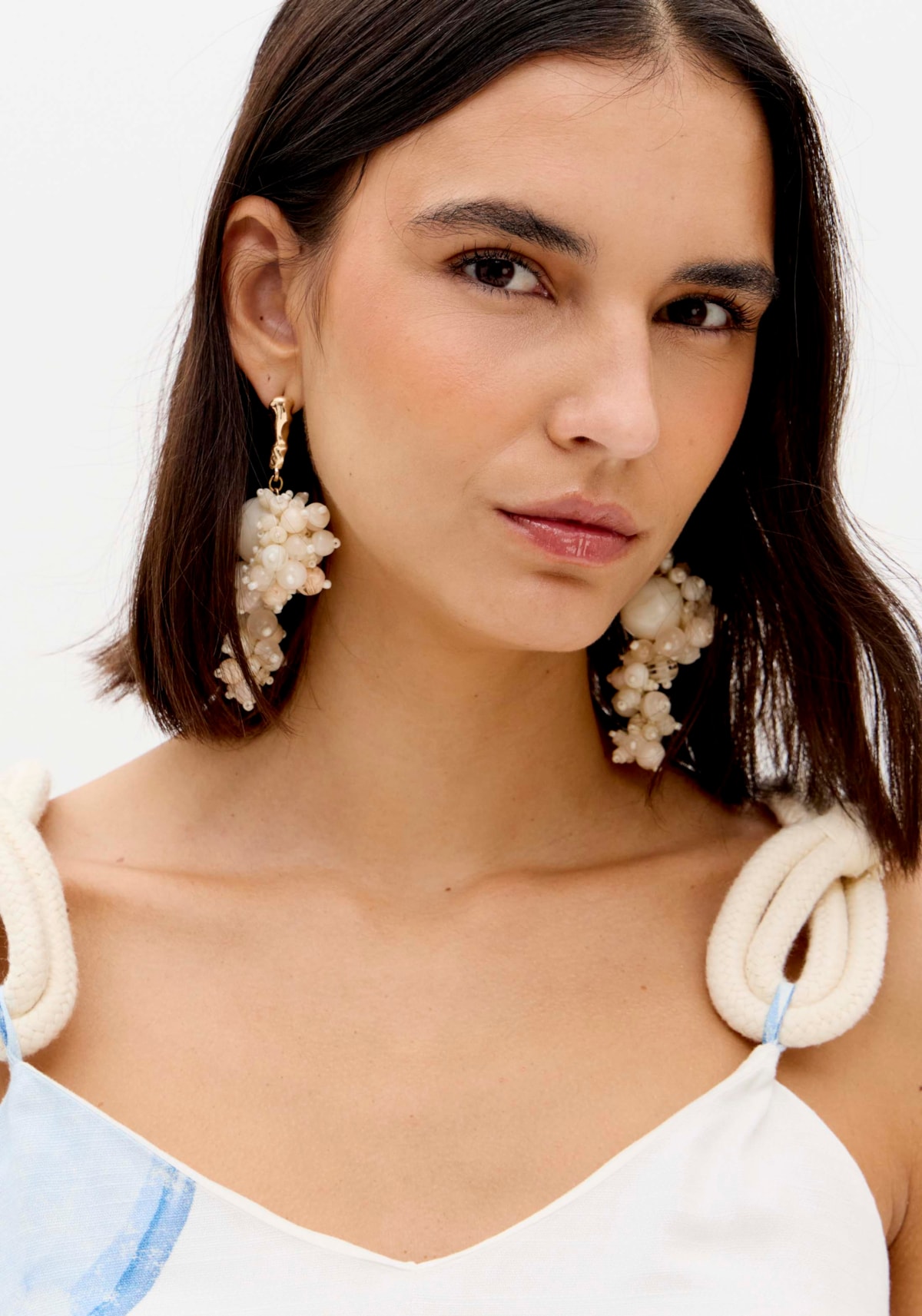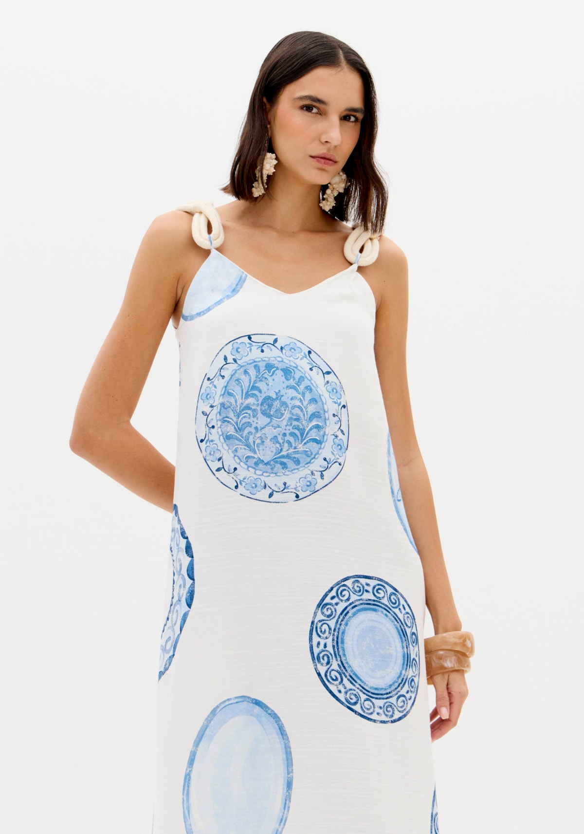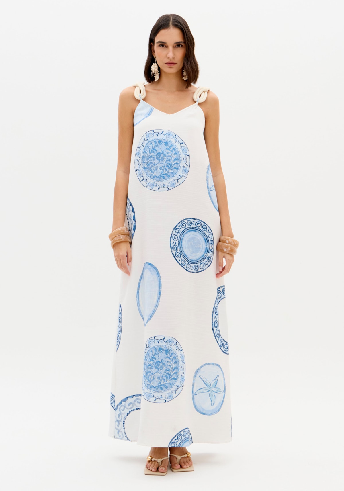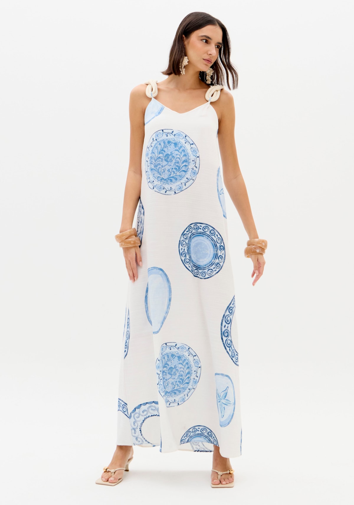 O vestido longo é confeccionado em tecido plano e leve com estampa exclusiva que realça o visual. apresenta decote em v, alças finas adornadas por detalhe em corda e corte evasê com caimento solto que se amplia suavemente até a barra. Aposte na fluidez!