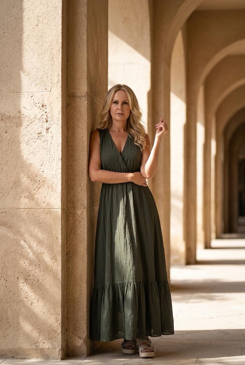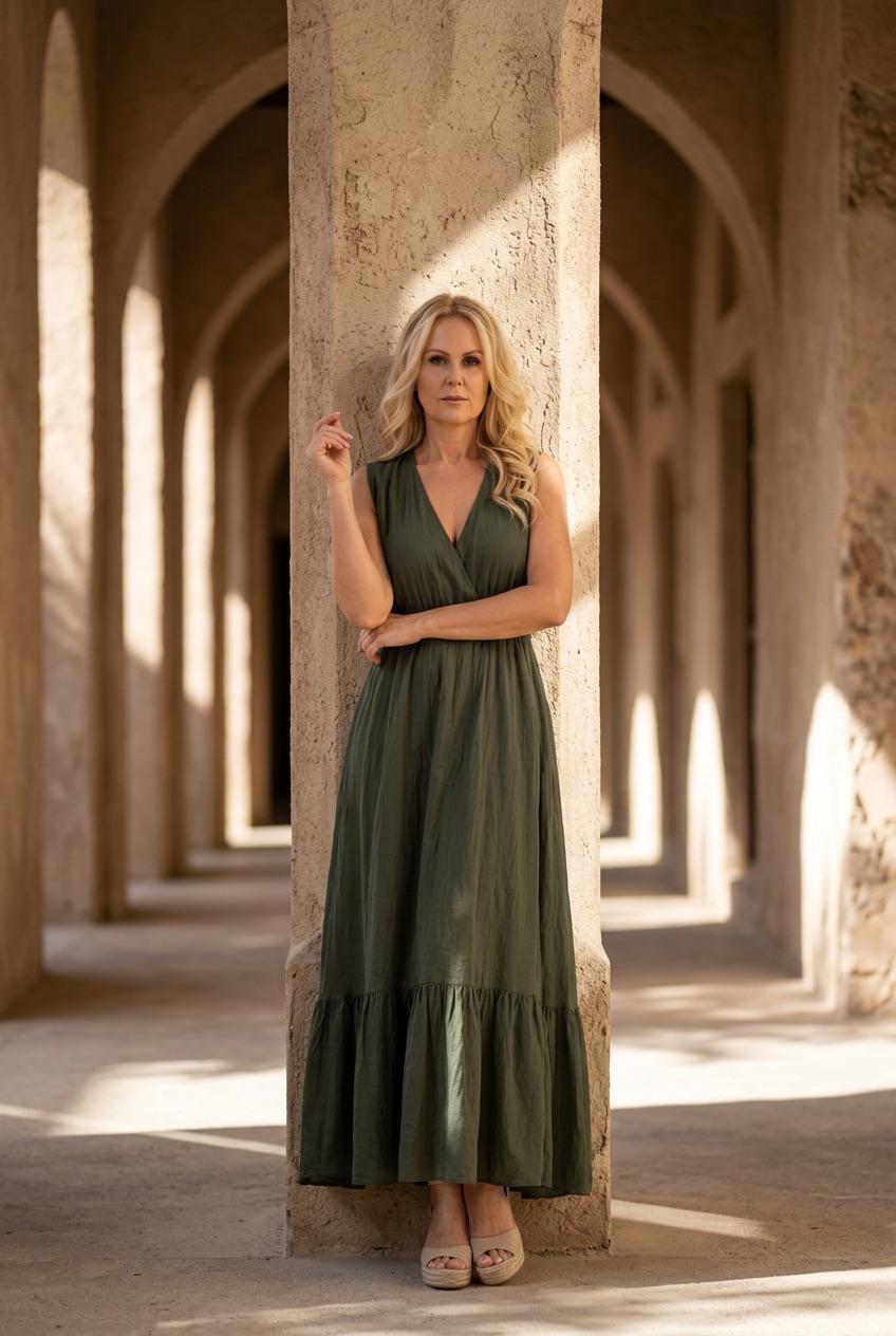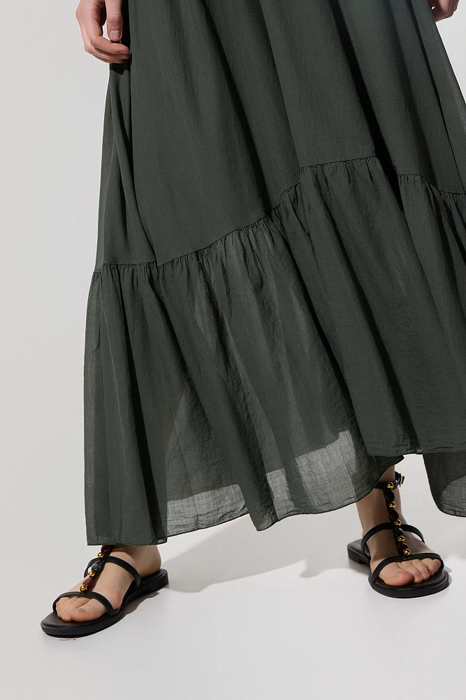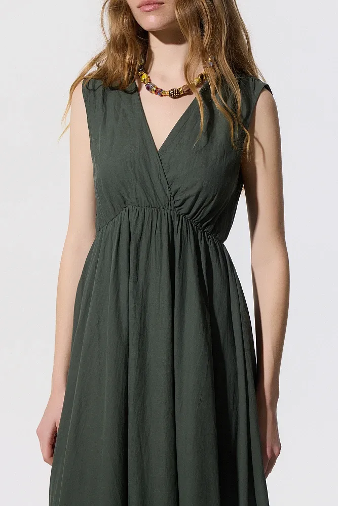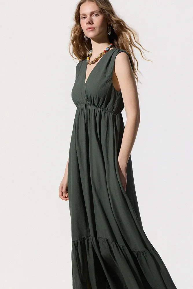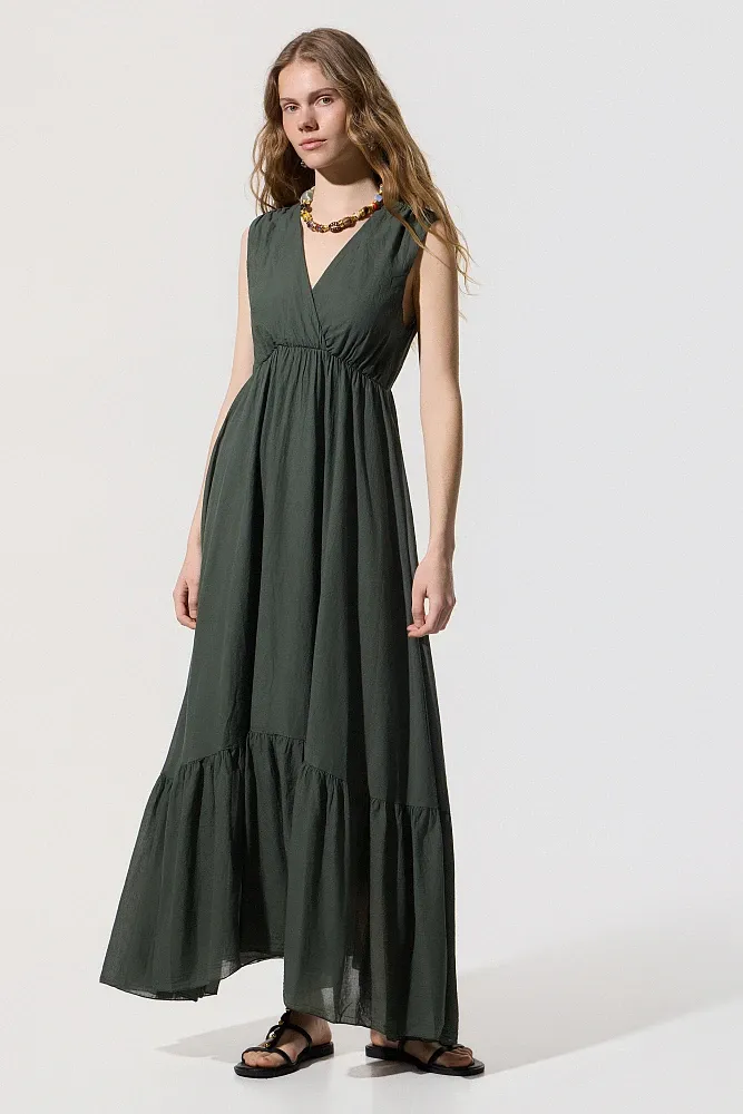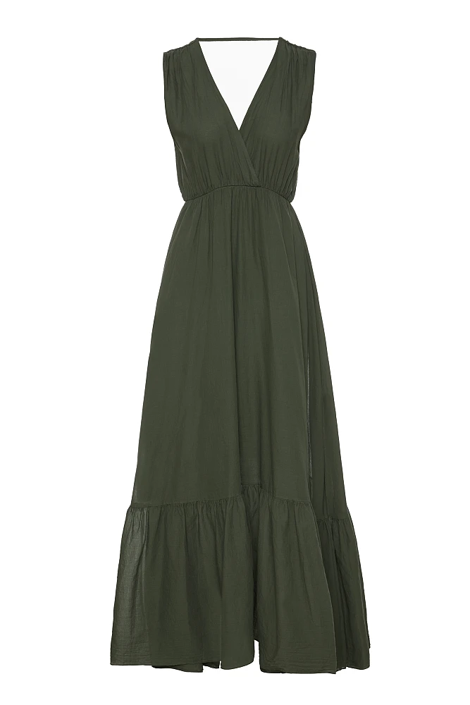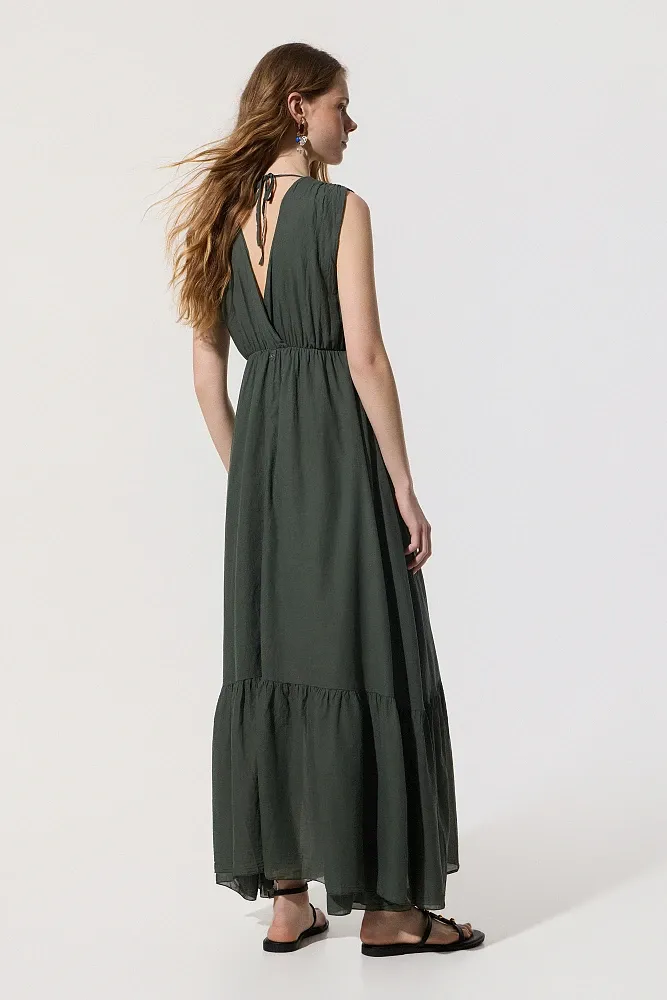 Vestido longo com babados, sem mangas, decote em V, elástico abaixo do busto, com forro interno, fechamento com amarração em formato de gota, textura macia, modelagem regular.