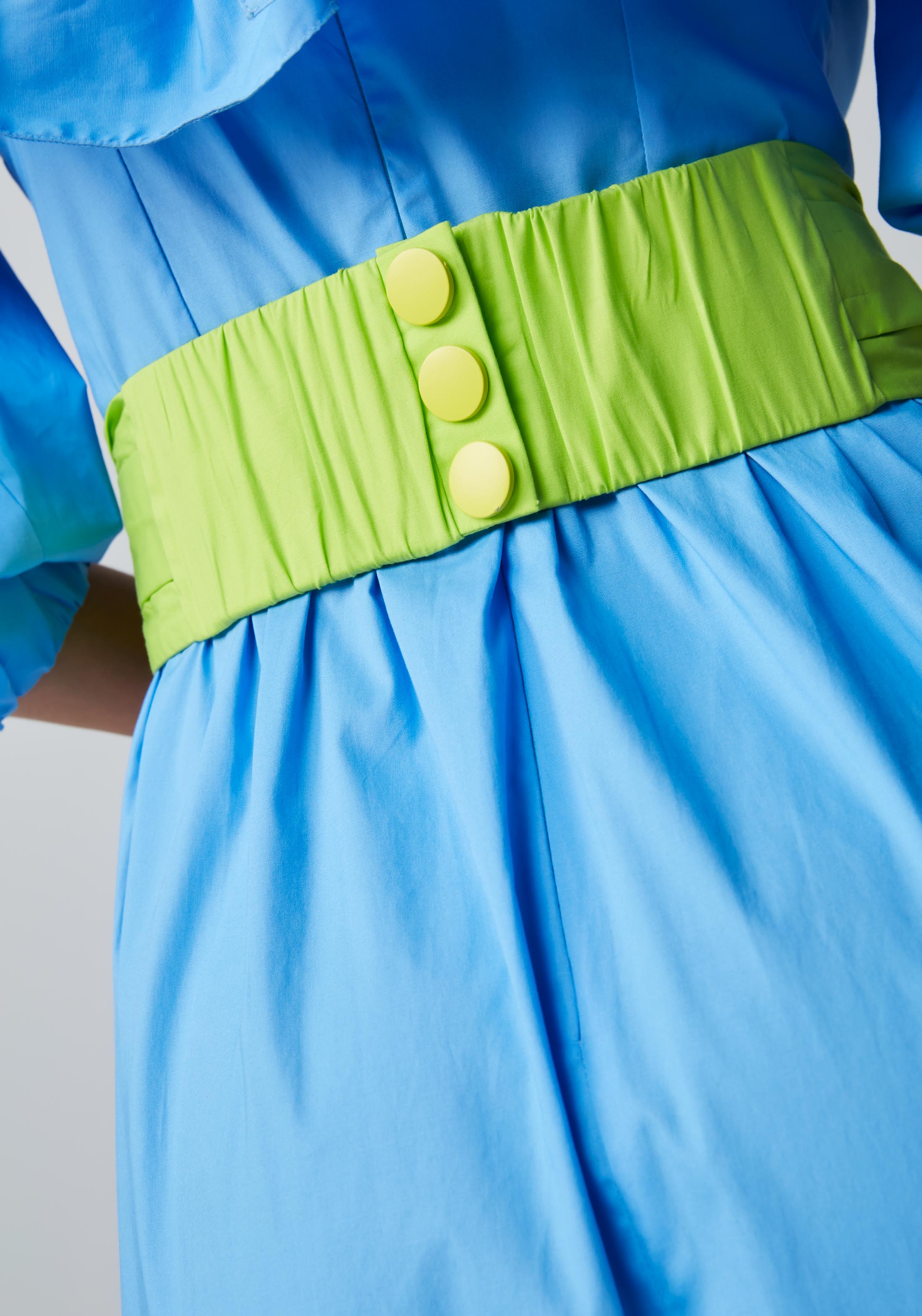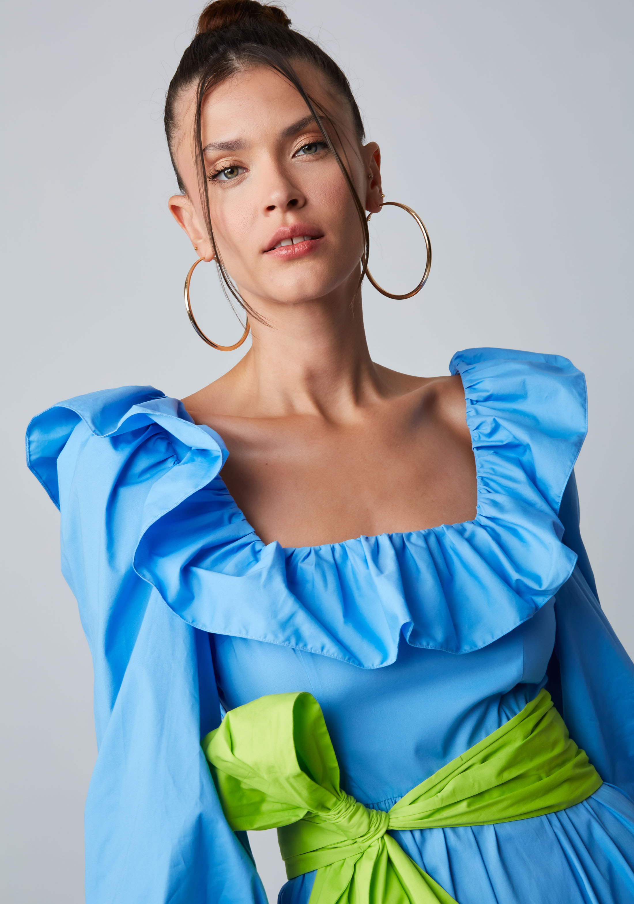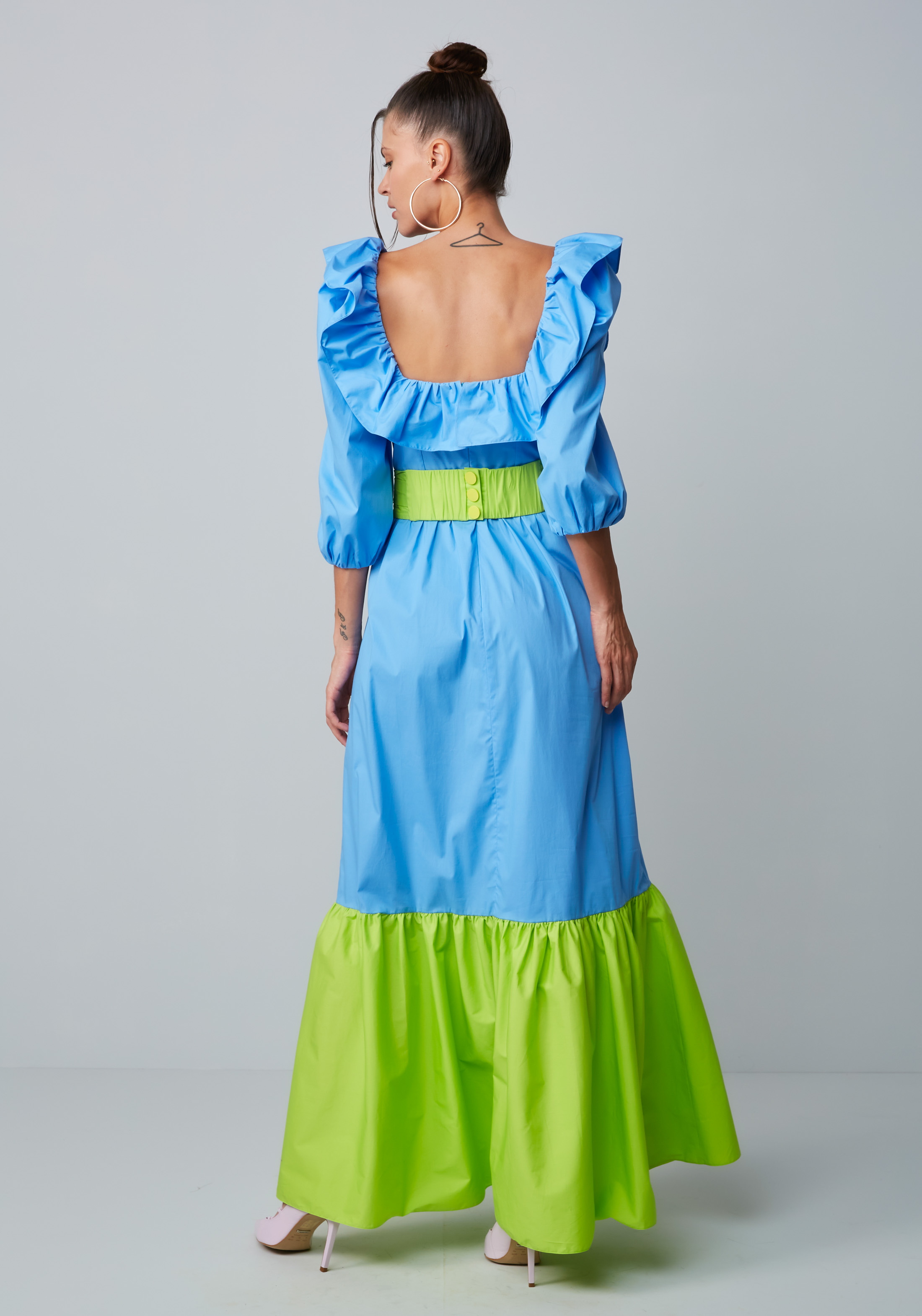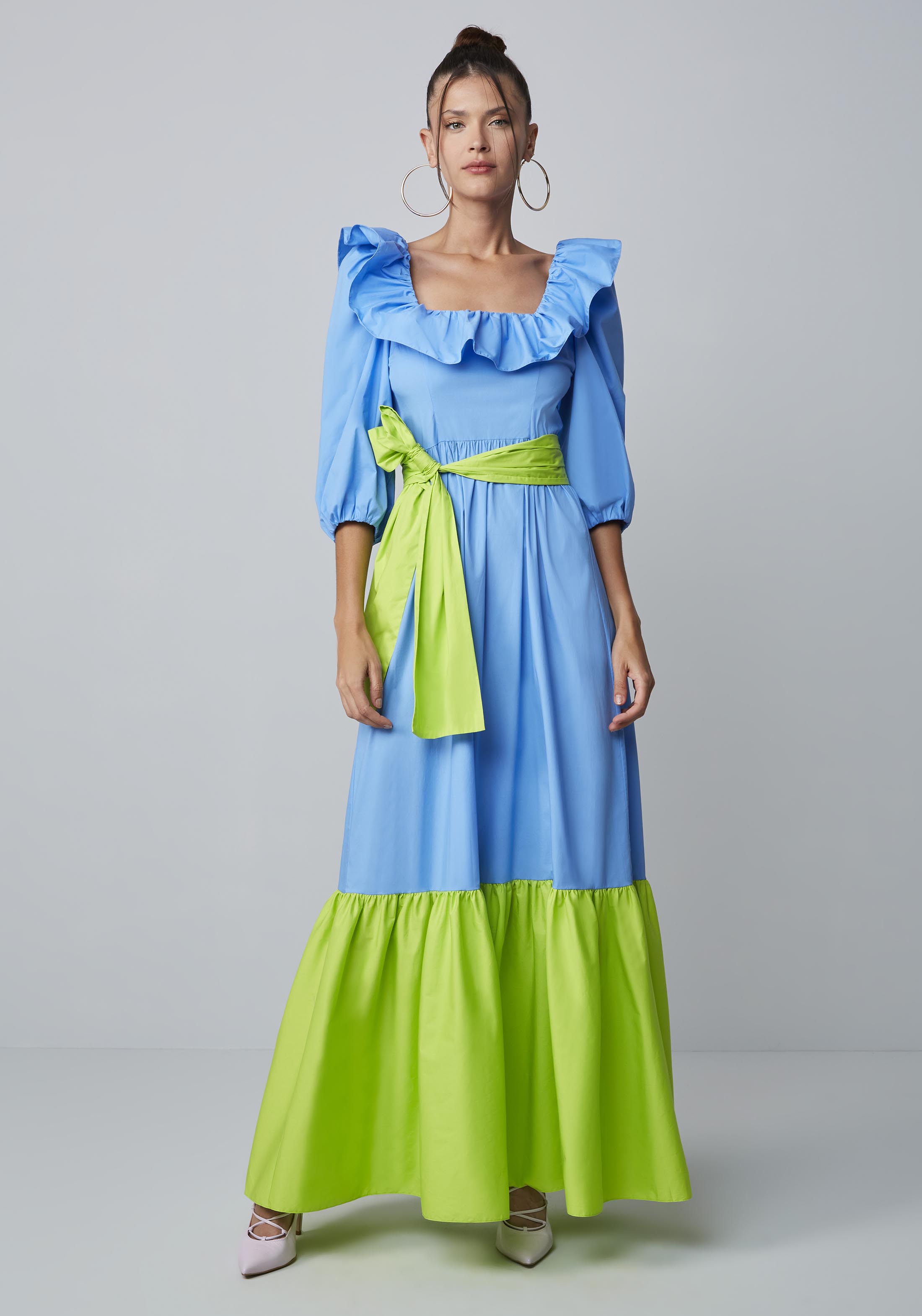 VESTIDO COM DECOTE QUADRADO E SILHUETA LONGA, O VESTIDO POSSUI MANGA LONGA E BABADOS NO BUSTO, ACOMPANHA FAIXA DE AMARRAÇÃO NA CINTURA. A TENDÊNCIA DOS LOOKS BICOLORES TEM GANHADO FORÇA E PROMETE ESTAR EM ALTA NESSA ESTAÇÃO.