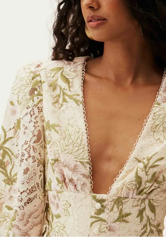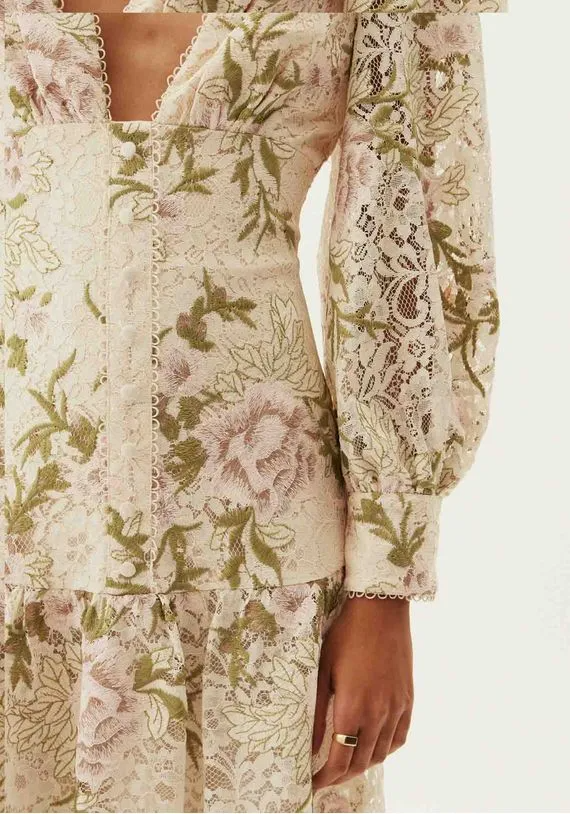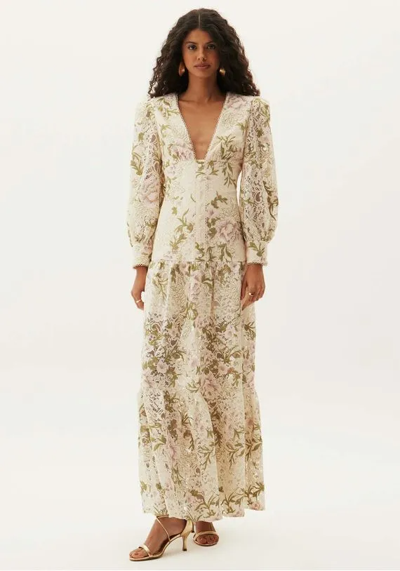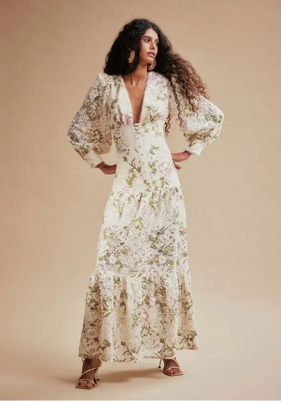 O vestido longo possui detalhes mangas bufantes tornando a peça super romântica. Aposte!