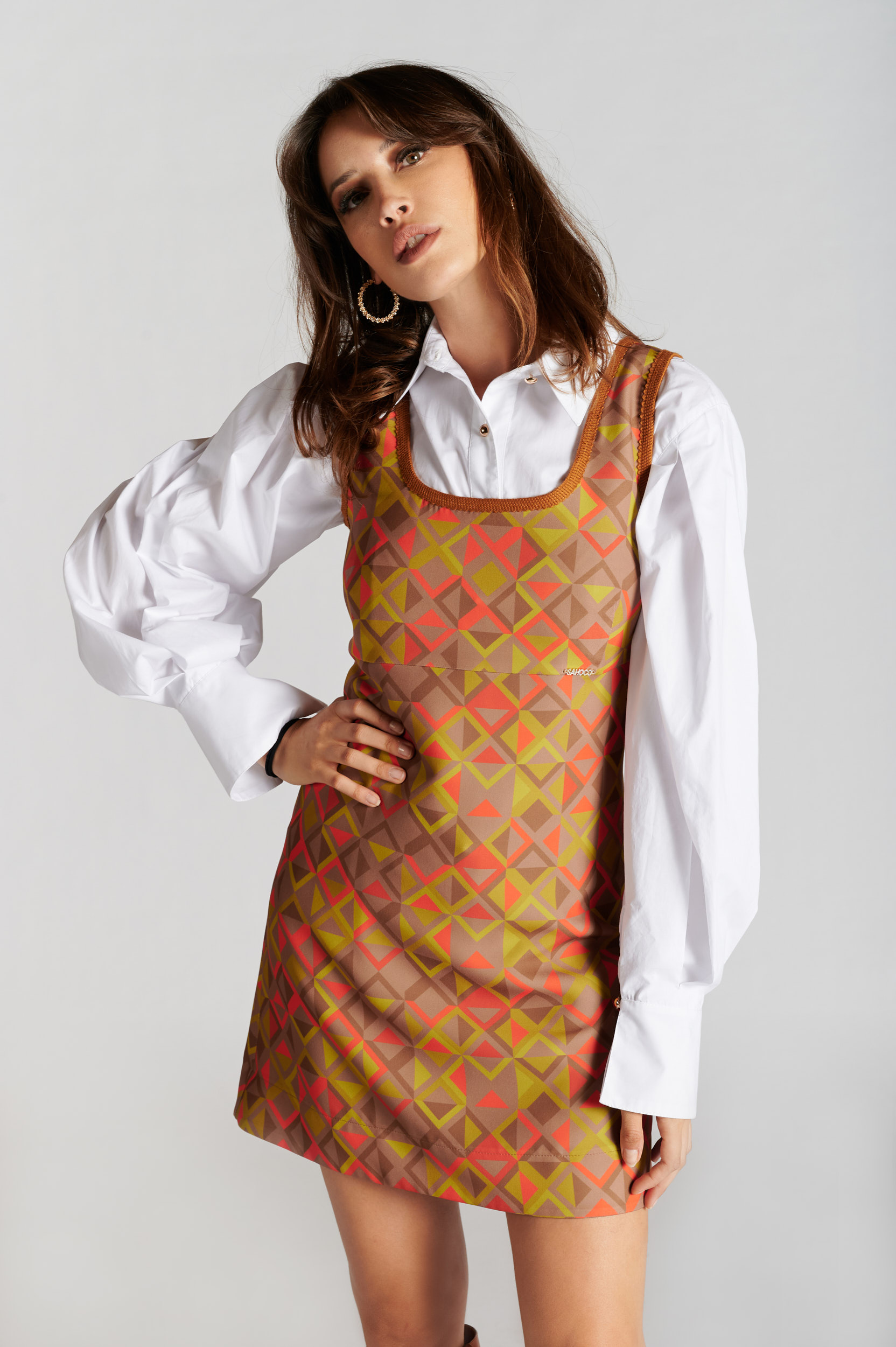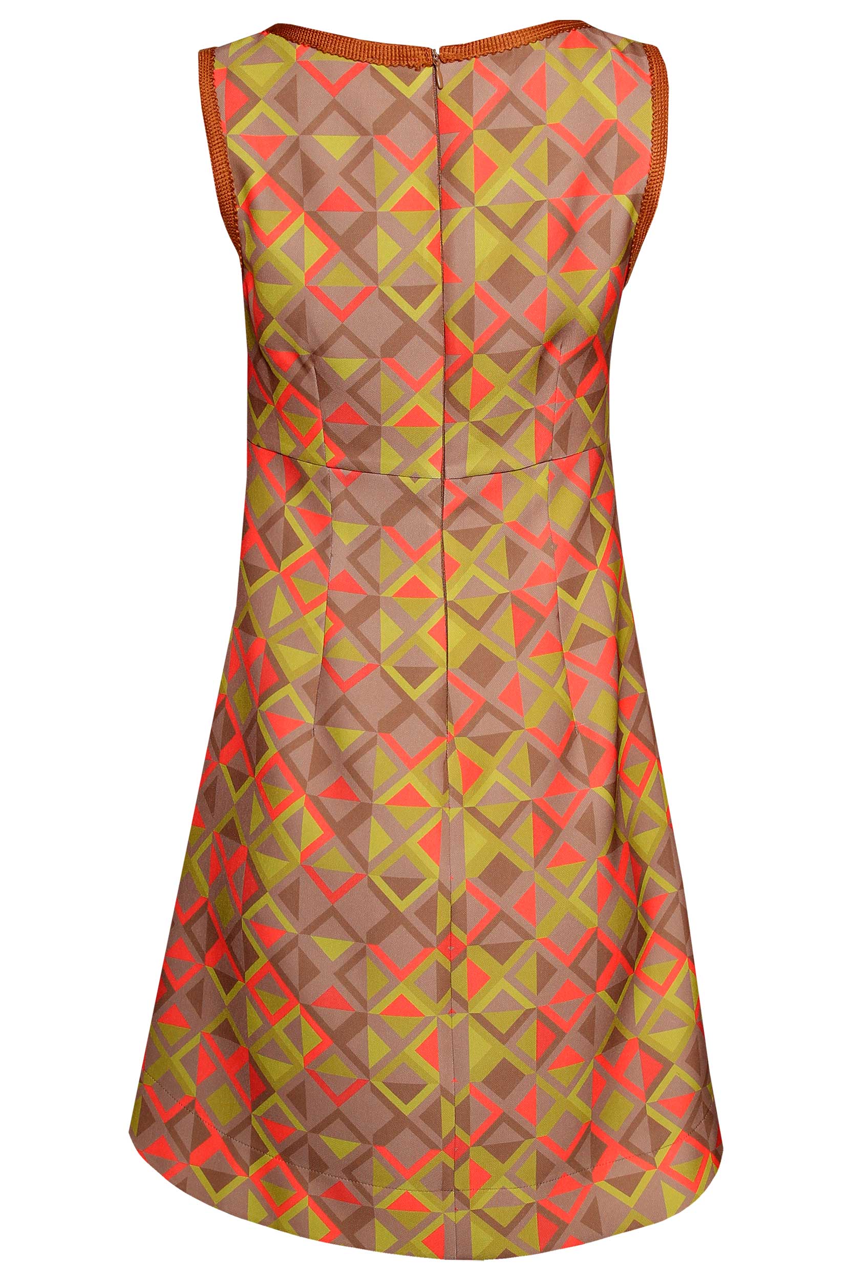 estido curto de corte em A estampado, de manga cava e decote semi quadrado. Peça avivada no decote e nas cavas. Fecho atrás mediante fecho de correr invisível.