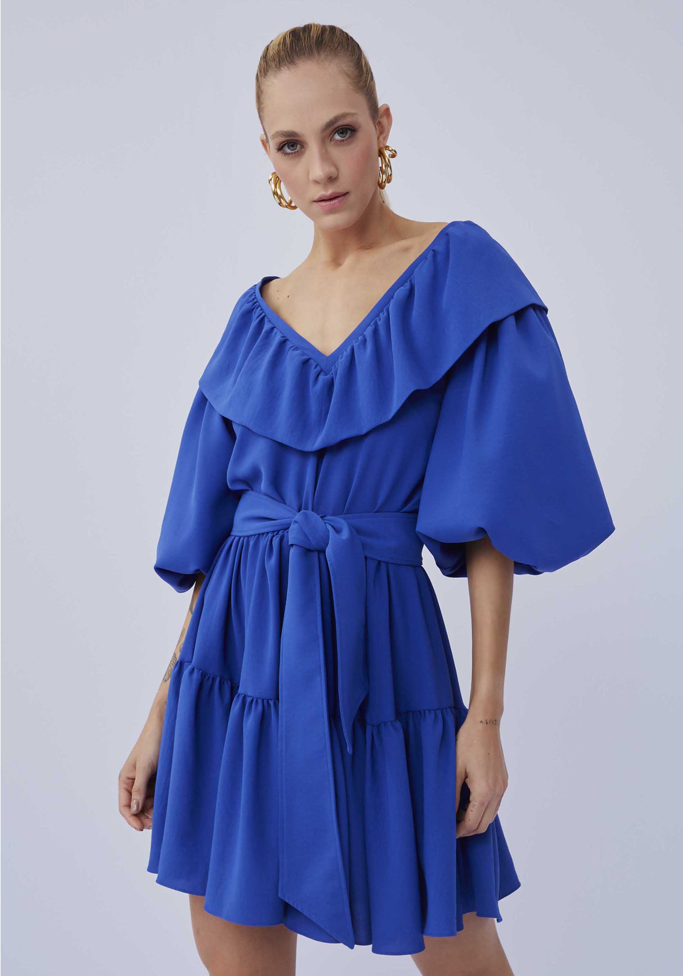 VESTIDO CURTO MARCADO POR TENDÊNCIA DE MODA. SEU DECOTE EM V POSSUI BABADOS, AS CAMADAS TRAZEM AR ROMÂNTICO COMBINADAS COM AS MANGAS MÉDIAS BALONÊ. POSSUI FAIXA PARA AMARRAÇÃO NA CINTURA QUE VALORIZA AINDA MAIS SEU SHAPE. FINALIZEM C