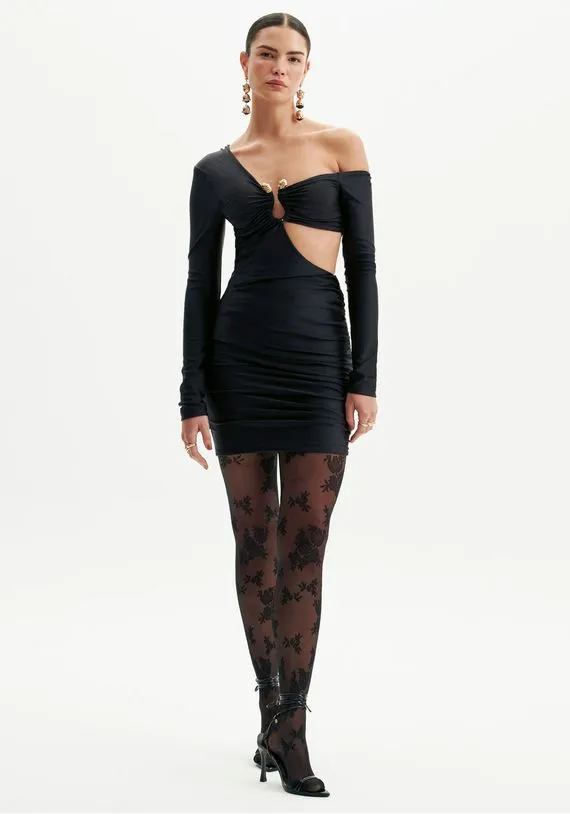 vestido possui ombro único, recortes na lateral e shape justo. O cut out com detalhe metalizado agrega ainda mais charme a peça. Ideal para eventos noturnos, é uma aposta para você não passar despercebida