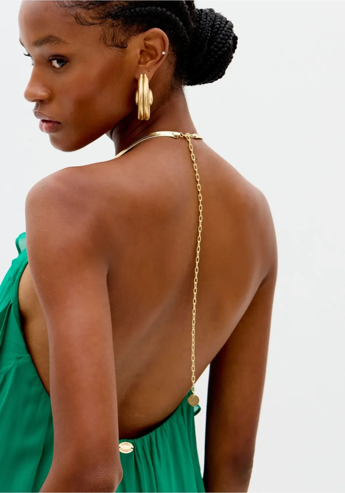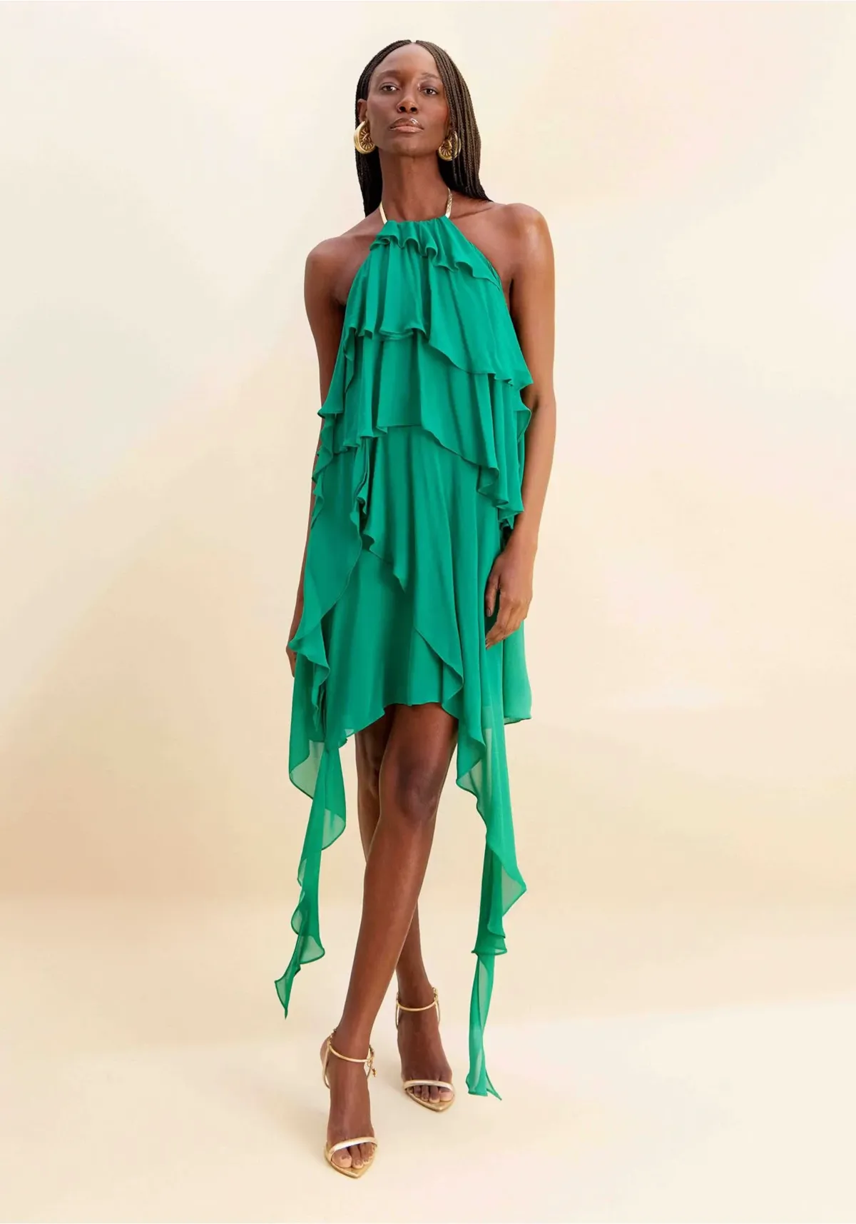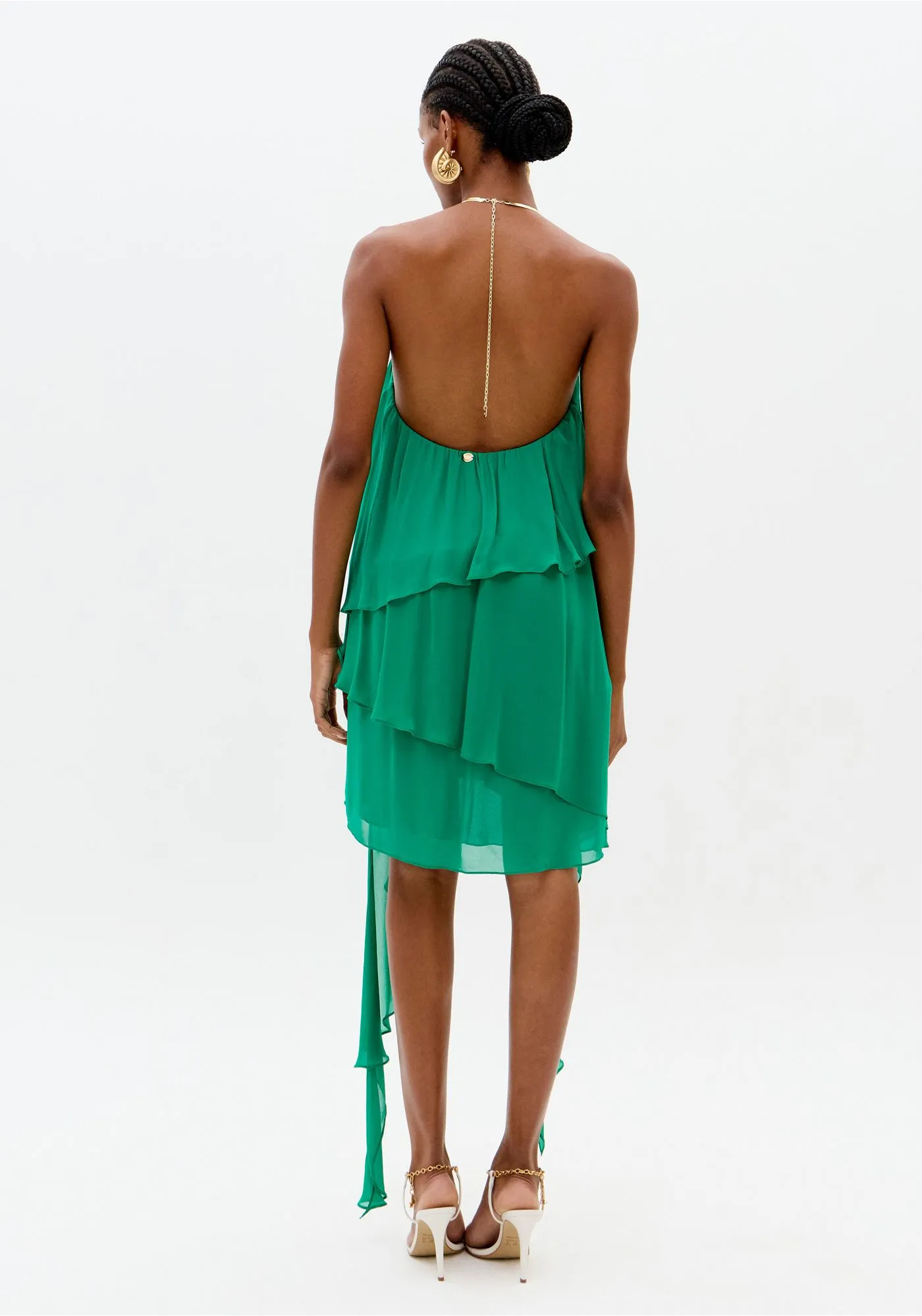Feito em tecido leve e fluido com transparência sutil, o vestido curto de modelagem frente única traz fechamento em corrente no decote, adicionando elegância ao look. Seu caimento solto é valorizado por camadas que conferem movimento e leveza. Icônico!