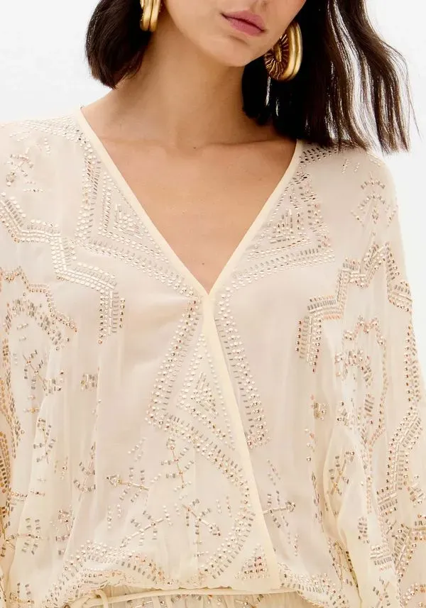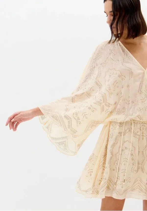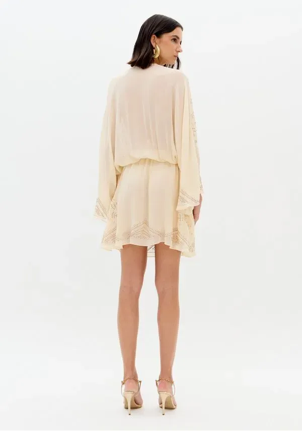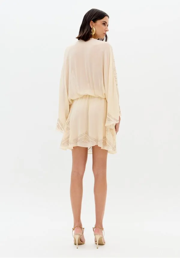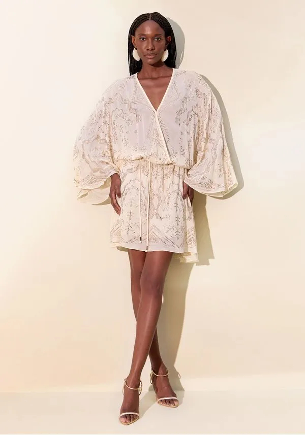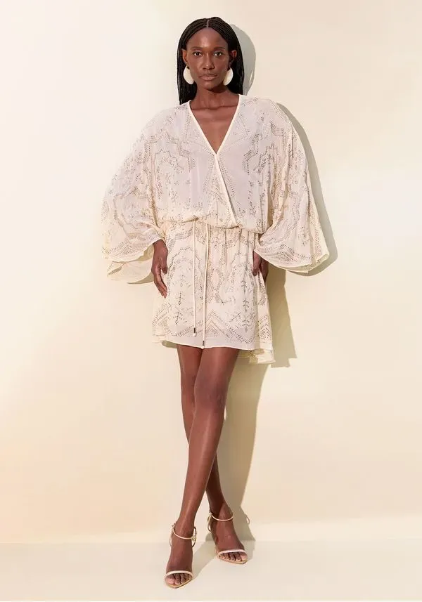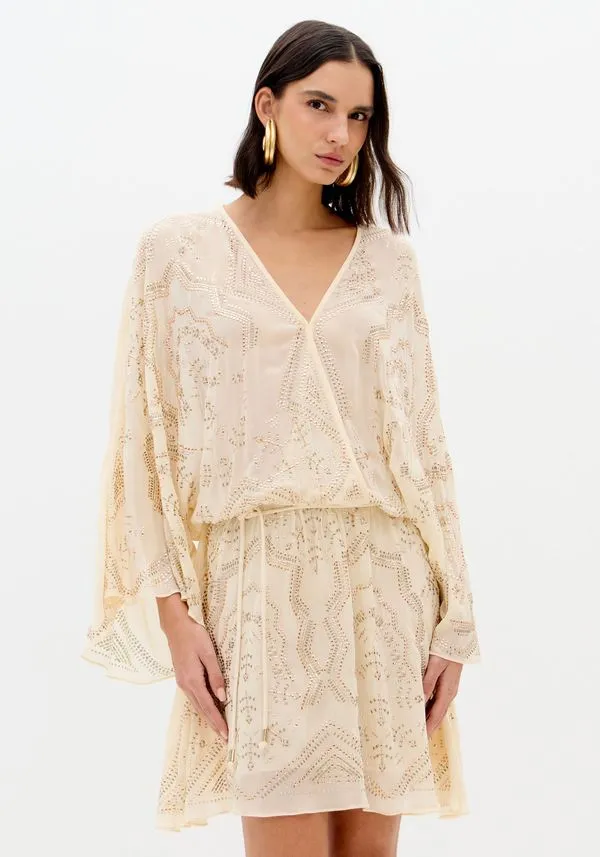 Feito em tecido fluido com transparência sutil, o vestido curto solto no corpo exibe mangas longas e amplas, decote em v e cinto em cordão. Os cristais aplicados em padrão exuberante elevam o visual com um brilho refinado. Peça-chave para celebrações!