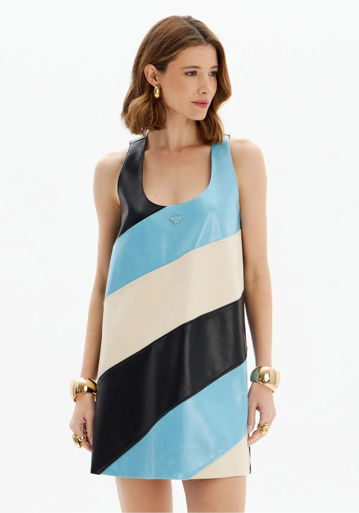 Confeccionado em pu, o vestido curto tem caimento solto, decote em u e recortes em diferentes cores que formam um mosaico marcante na parte frontal. O zíper posterior garante praticidade no vestir. ideal para composições autênticas!
