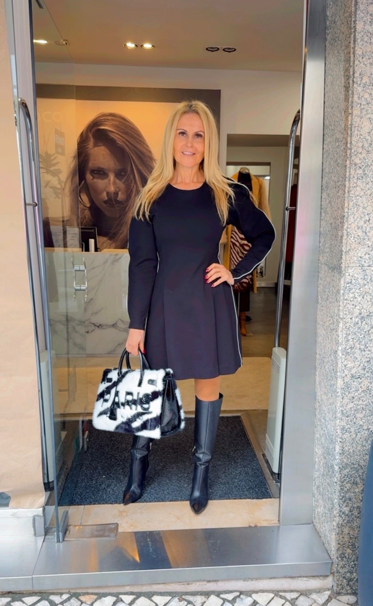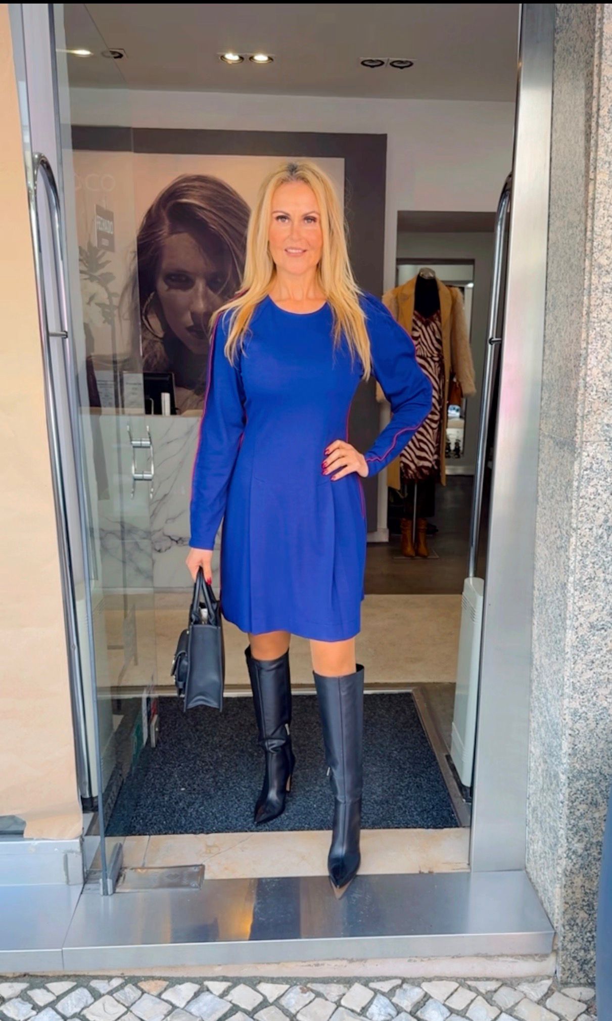Vestido curto em malha técnica de estrutura suave e ligeiramente elástica. O corte ajustado ao tronco e evasé na saia cria uma silhueta feminina e moderna. As riscas contrastantes nas mangas acrescentam um toque gráfico subtil, equilibrando desportividade e elegância.