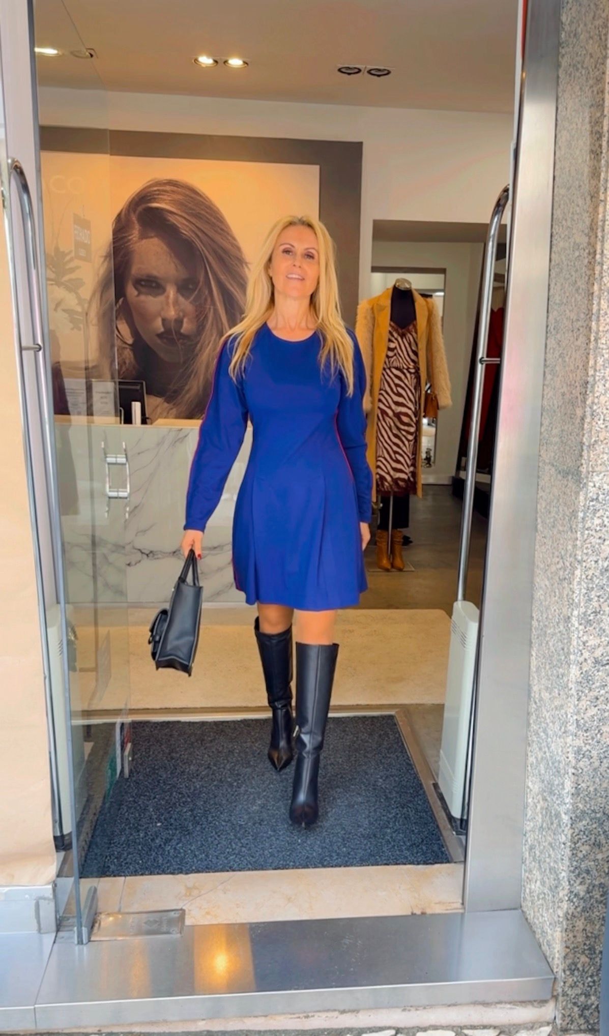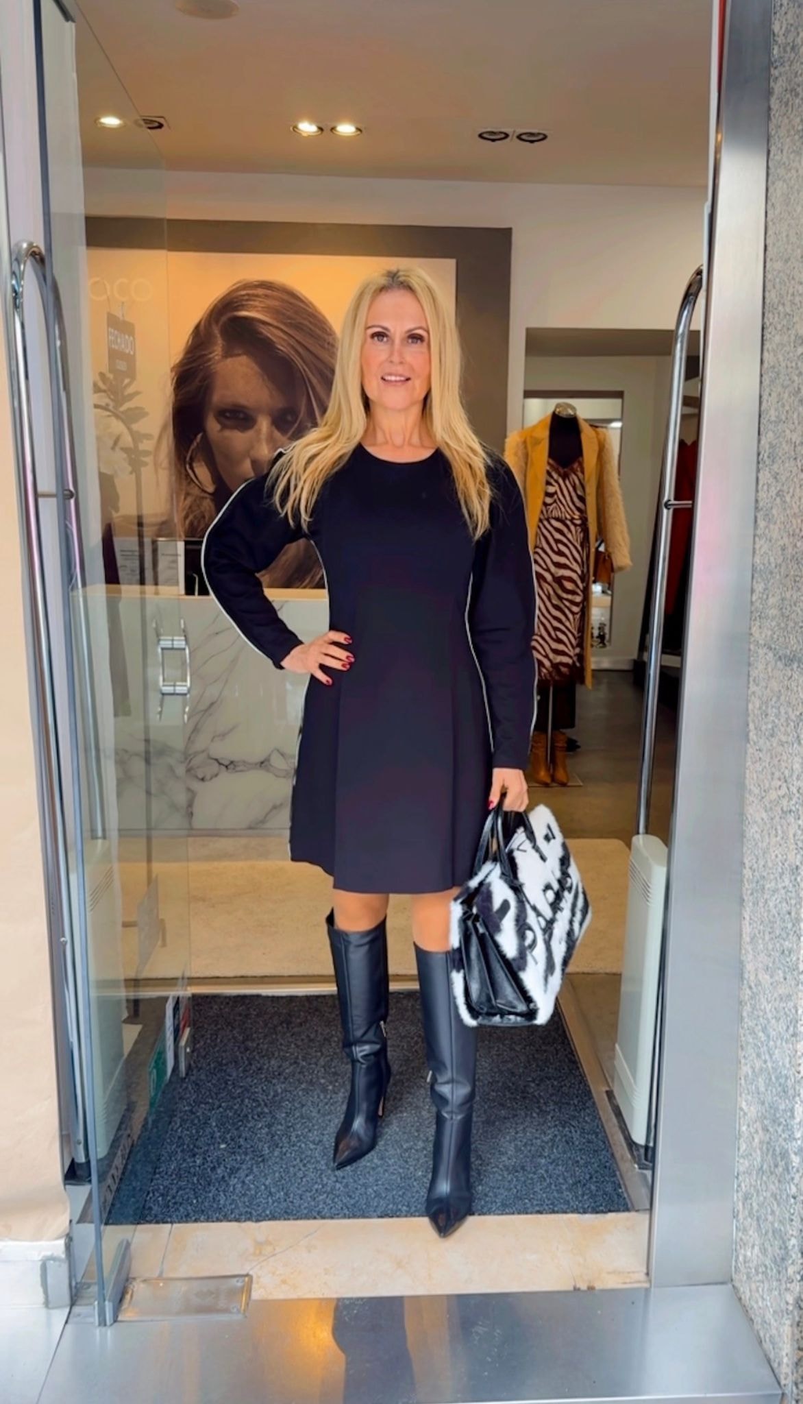Vestido curto em malha técnica de estrutura suave e ligeiramente elástica. O corte ajustado ao tronco e evasé na saia cria uma silhueta feminina e moderna. As riscas contrastantes nas mangas acrescentam um toque gráfico subtil, equilibrando desportividade e elegância.
