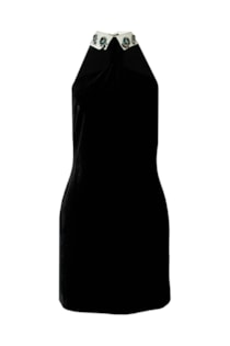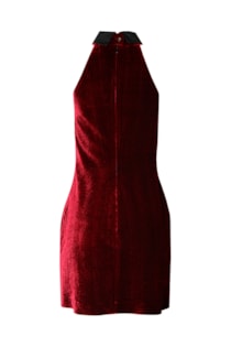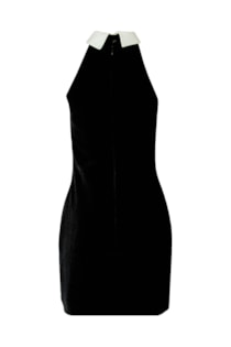 Vestido curto em veludo. Corte evasé. Decote halter com gola removível em popelina com aplicação em joías.