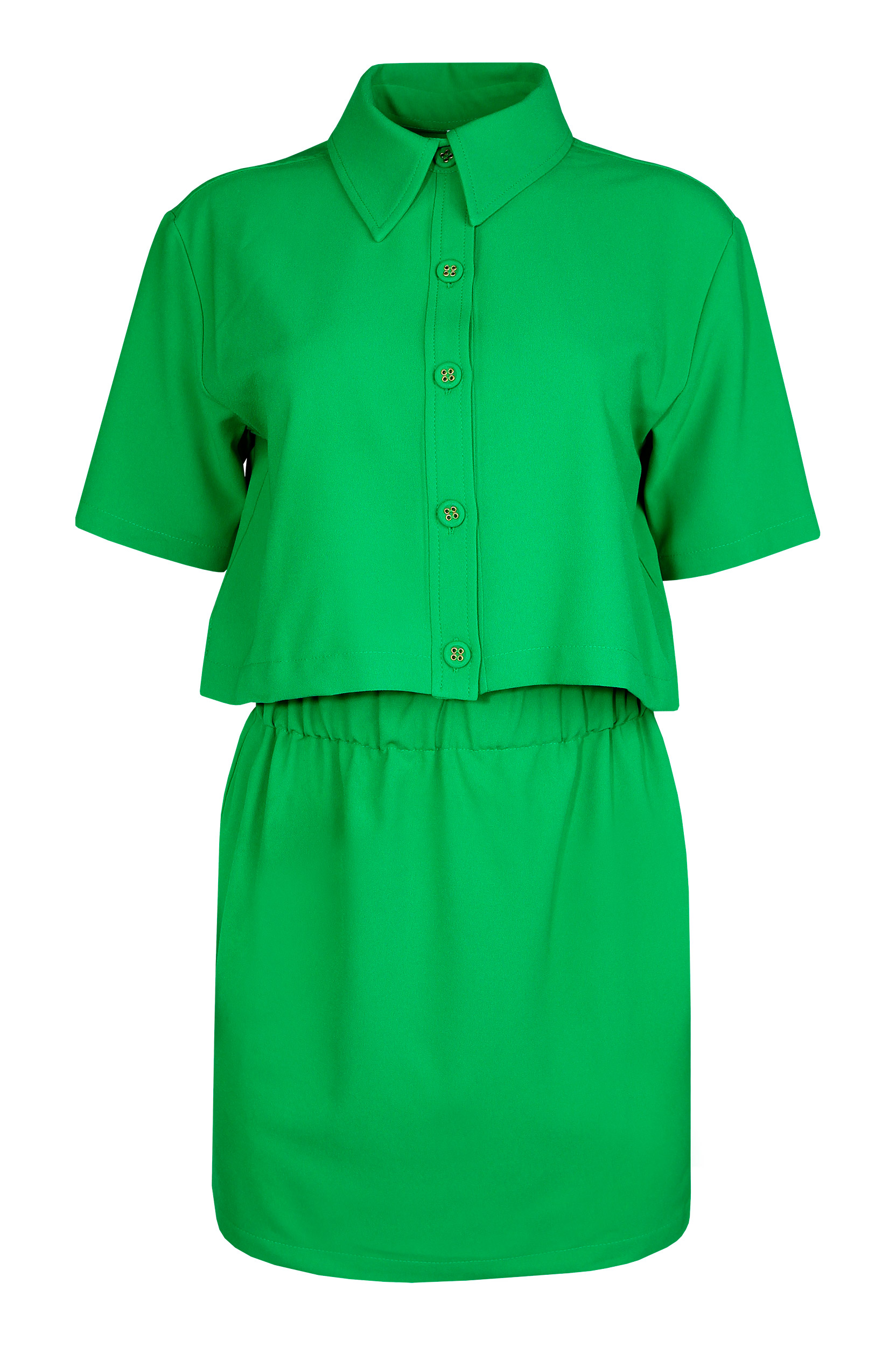 Vestido curto de mangas curtas e gola de abas estilo camiseiro. Unido na parte de trás e separado na parte da frente. Cintura elástica e parte de cima com fecho mediante botões à frente.