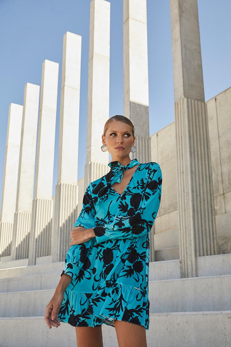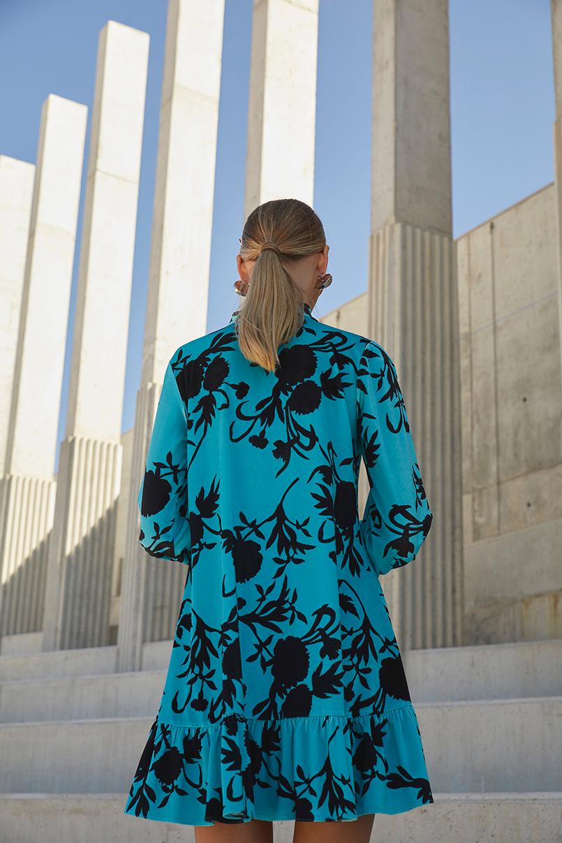 Vestido curto em tecido chiffon. Corte evasé. Manga comprida e gola alta com fecho atrás com botões.